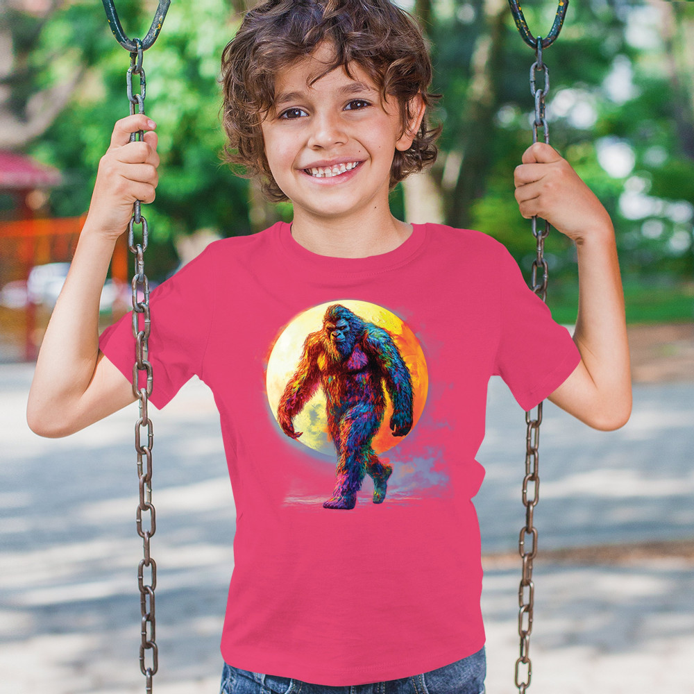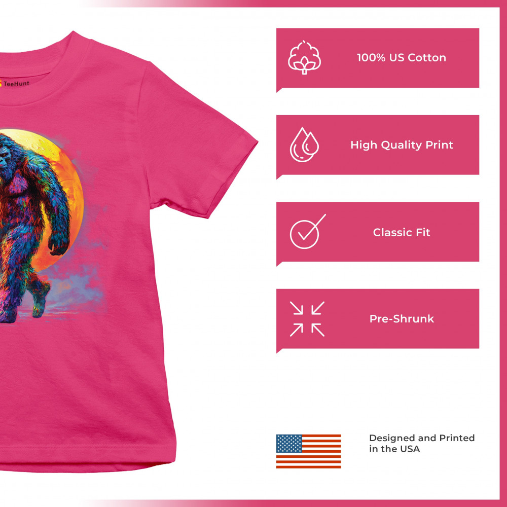 Rainbow Bigfoot under full moon design for cryptid lovers, festival goers, and psychedelic art fans. Bold, surreal, and eye-catching.