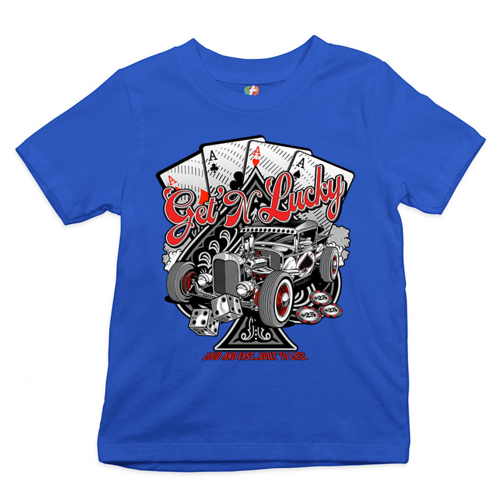 A print featuring a hot rod and a giant ace of spades behind it. In the background there are four aces of every suit. In front of the car there are 2 dices and several casino chips. The print says: "Get'n lucky, louad and fast… built to last". A great cho
