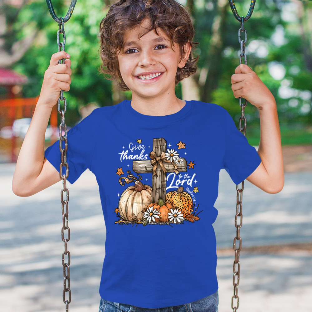 Thanksgiving design with pumpkins, daisies, and rustic cross. Perfect for Turkey Day, faithful family gatherings, and fall festival blessings.