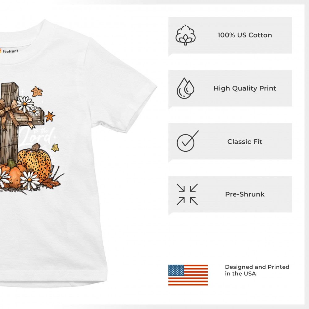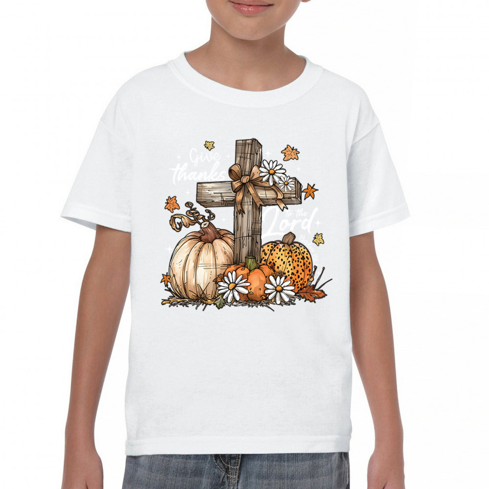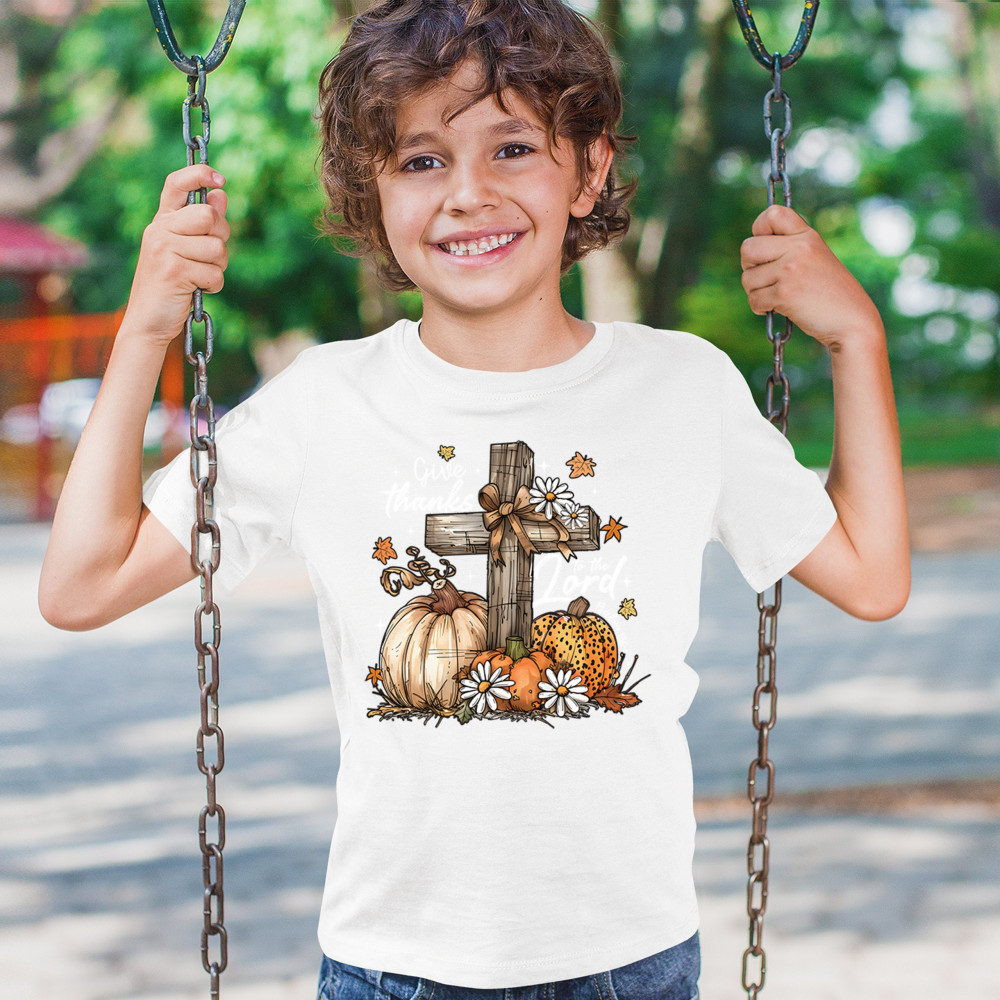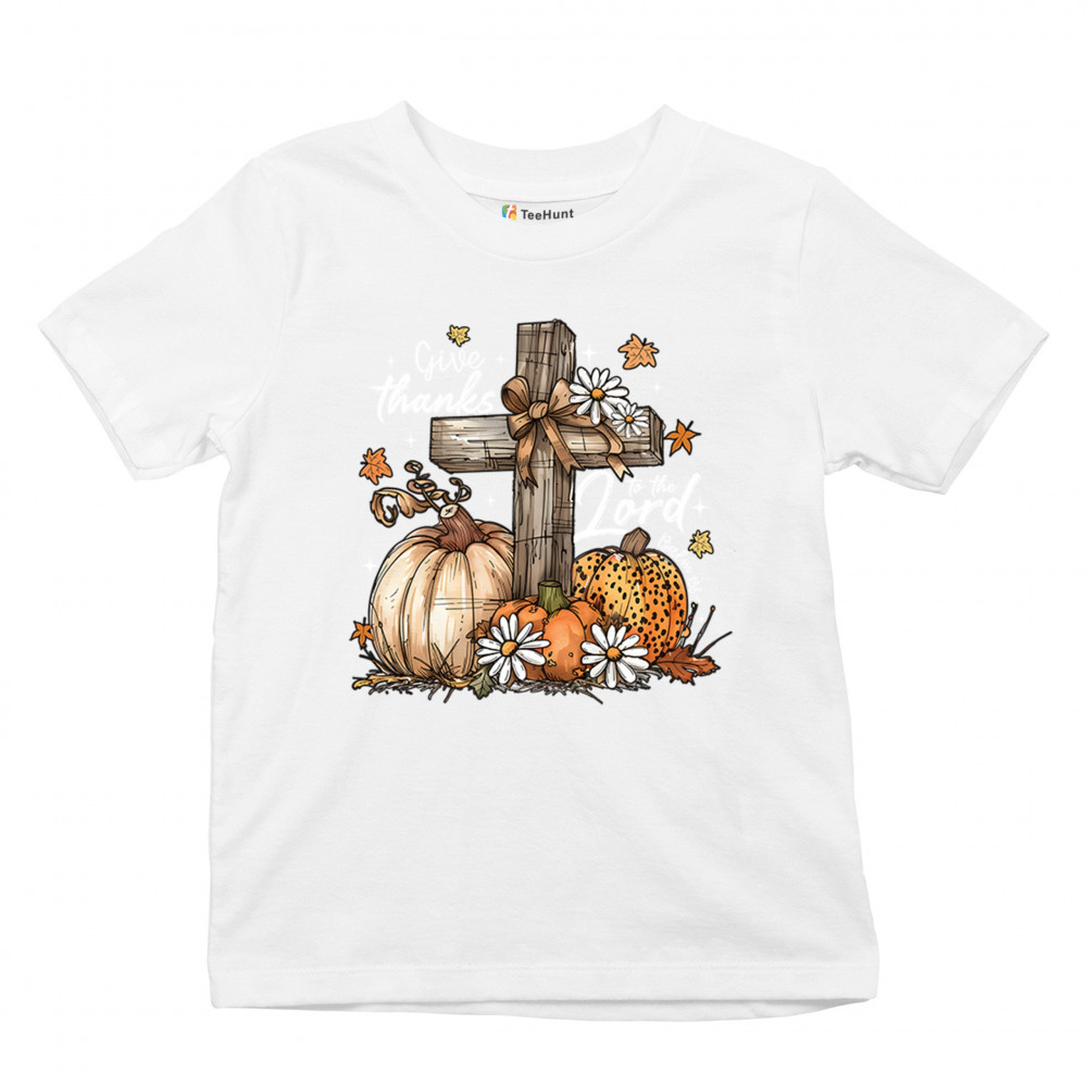Thanksgiving design with pumpkins, daisies, and rustic cross. Perfect for Turkey Day, faithful family gatherings, and fall festival blessings.