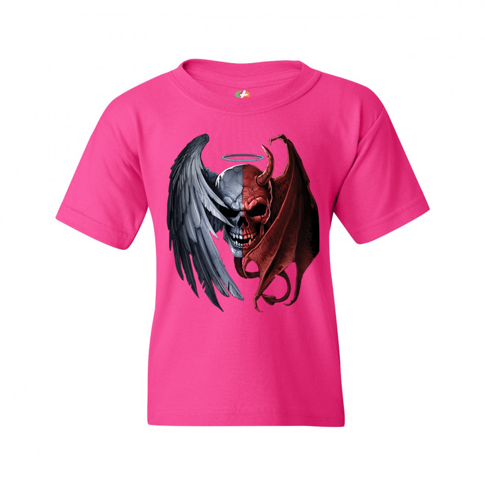 A print featuring a skull face, one half of which is light and has an angel's wing covering it and the other is dark with a horn sticking out of the forehead and a demon's wing. Below the skull you can see a demon's tail and a halo above it. A great