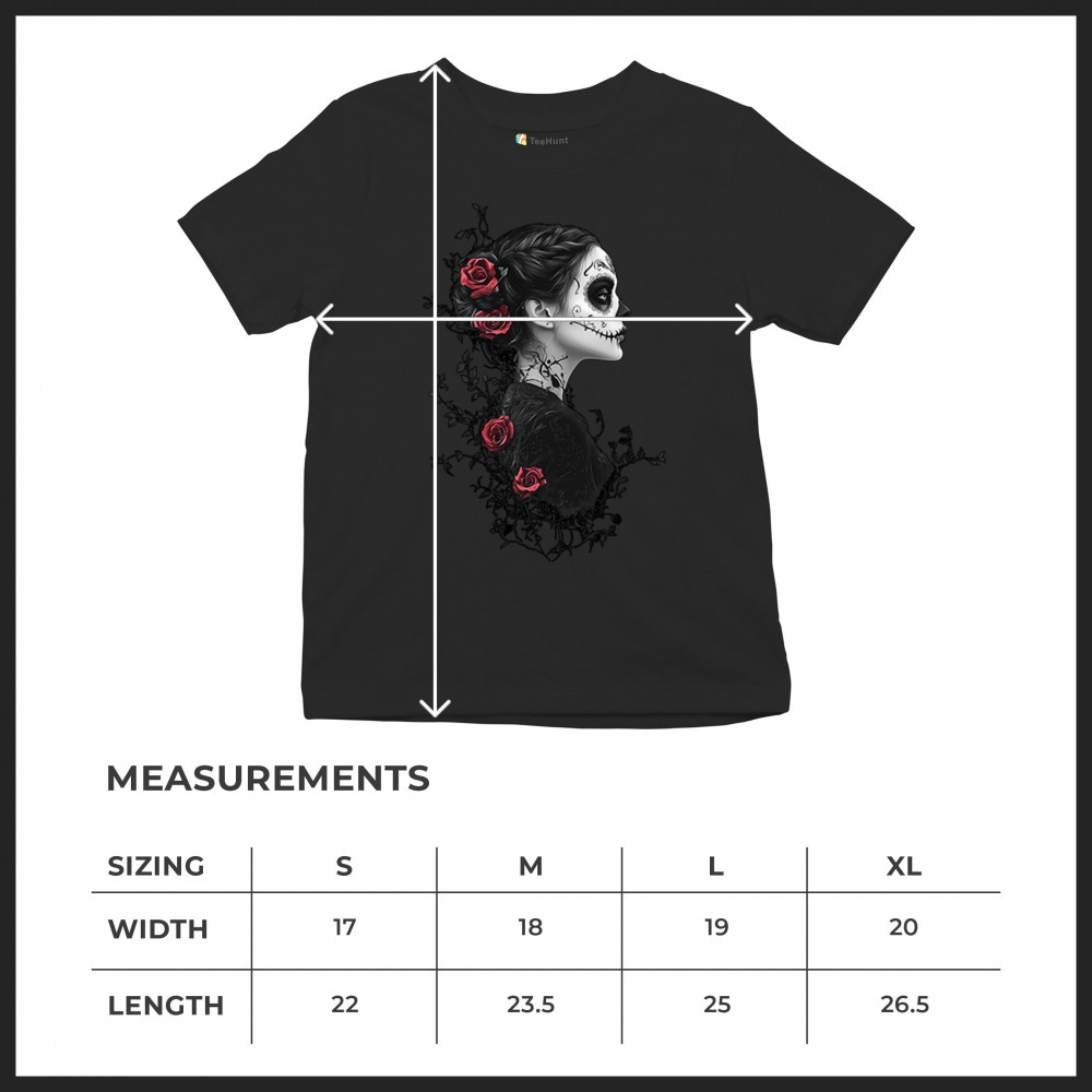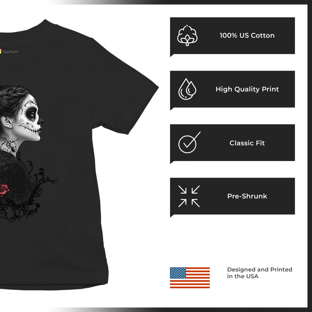 Celebrate Dia de los Muertos in style with this refined sugar skull woman design. Featuring a side profile view, vibrant red roses, and dark gothic floral elements, it creates a graceful balance between mystery and beauty. Ideal for fans of macabre art, skull themes, and honoring ancestral traditions through elegant visuals.
