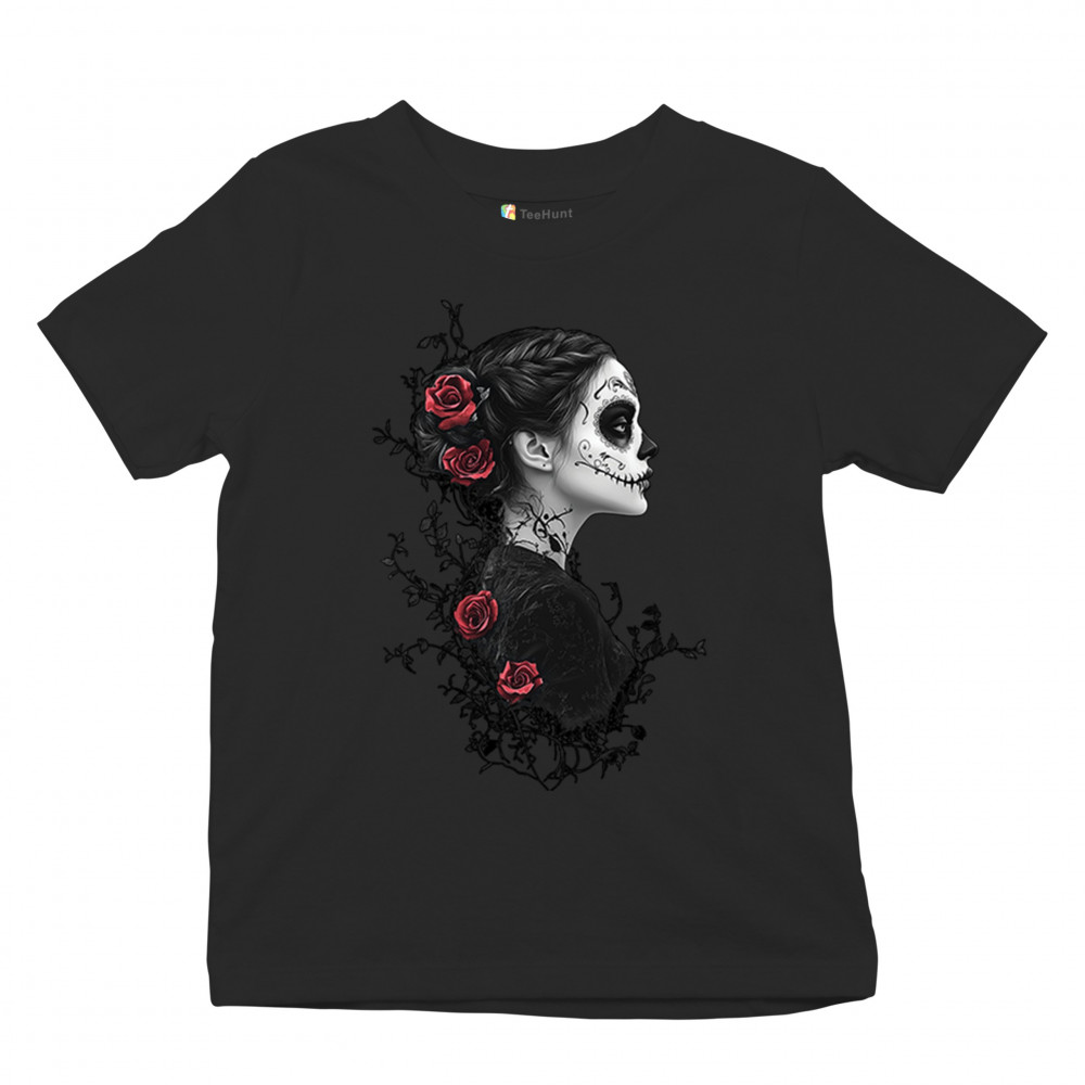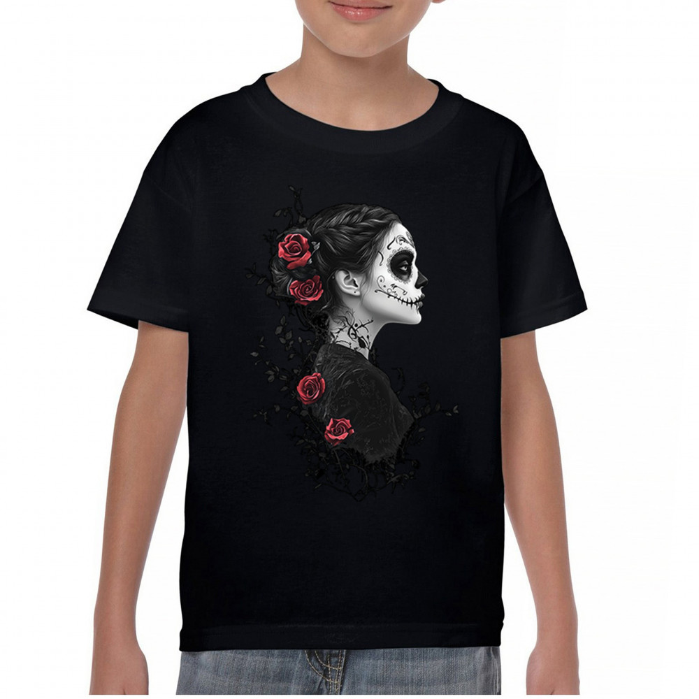 GOTHIC SUGAR SKULL ROSES youth t-shirt day of dead dark elegance skeleton kids black