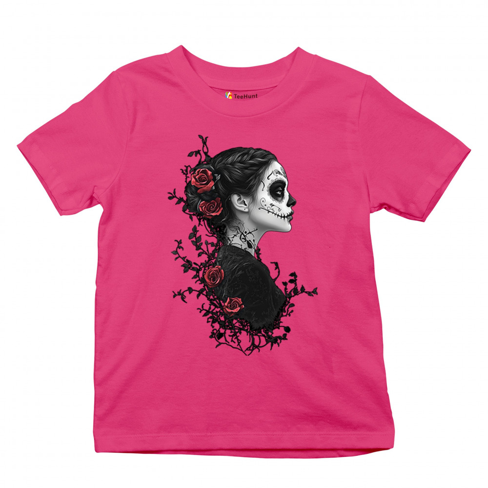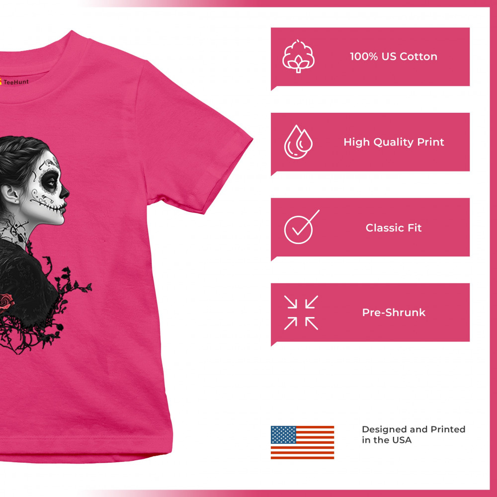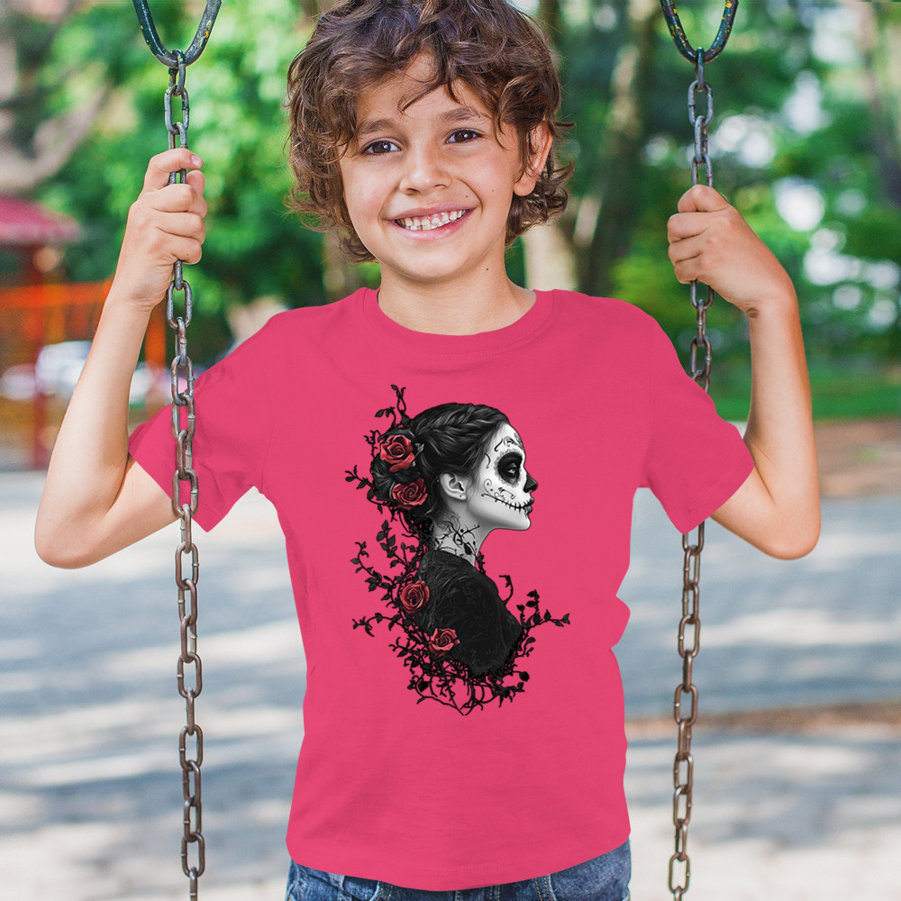 Celebrate Dia de los Muertos in style with this refined sugar skull woman design. Featuring a side profile view, vibrant red roses, and dark gothic floral elements, it creates a graceful balance between mystery and beauty. Ideal for fans of macabre art, skull themes, and honoring ancestral traditions through elegant visuals.