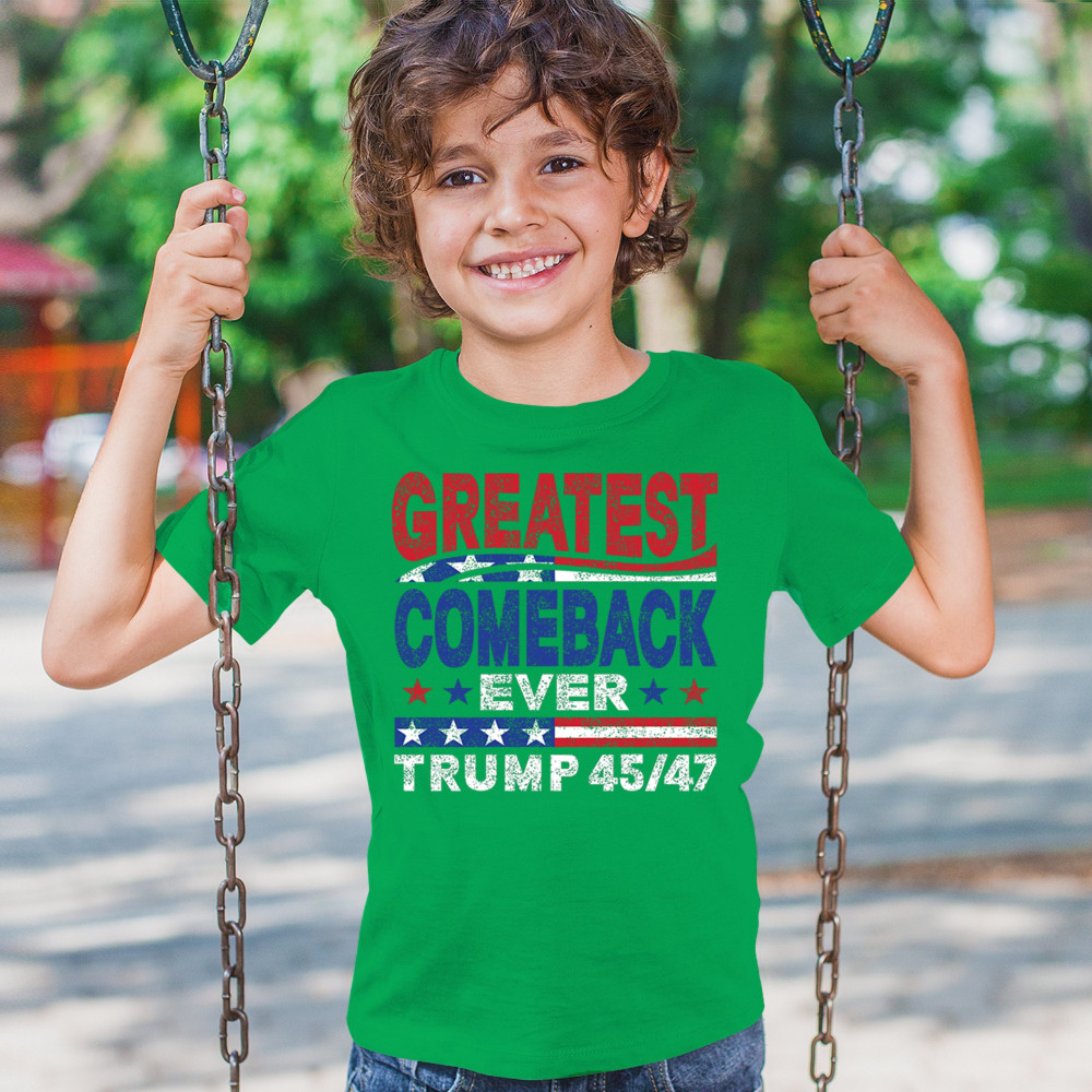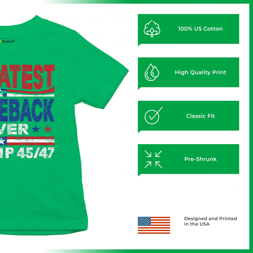 The "Greatest Comeback Ever" design is a tribute to resilience, patriotism, and the fight for American values. Featuring bold patriotic colors and a slogan that embodies the spirit of victory, this design is perfect for Trump supporters and conservatives who believe in never surrendering. Celebrate the leadership of Donald J. Trump as the 45th and 47th president and join the movement for America's future.