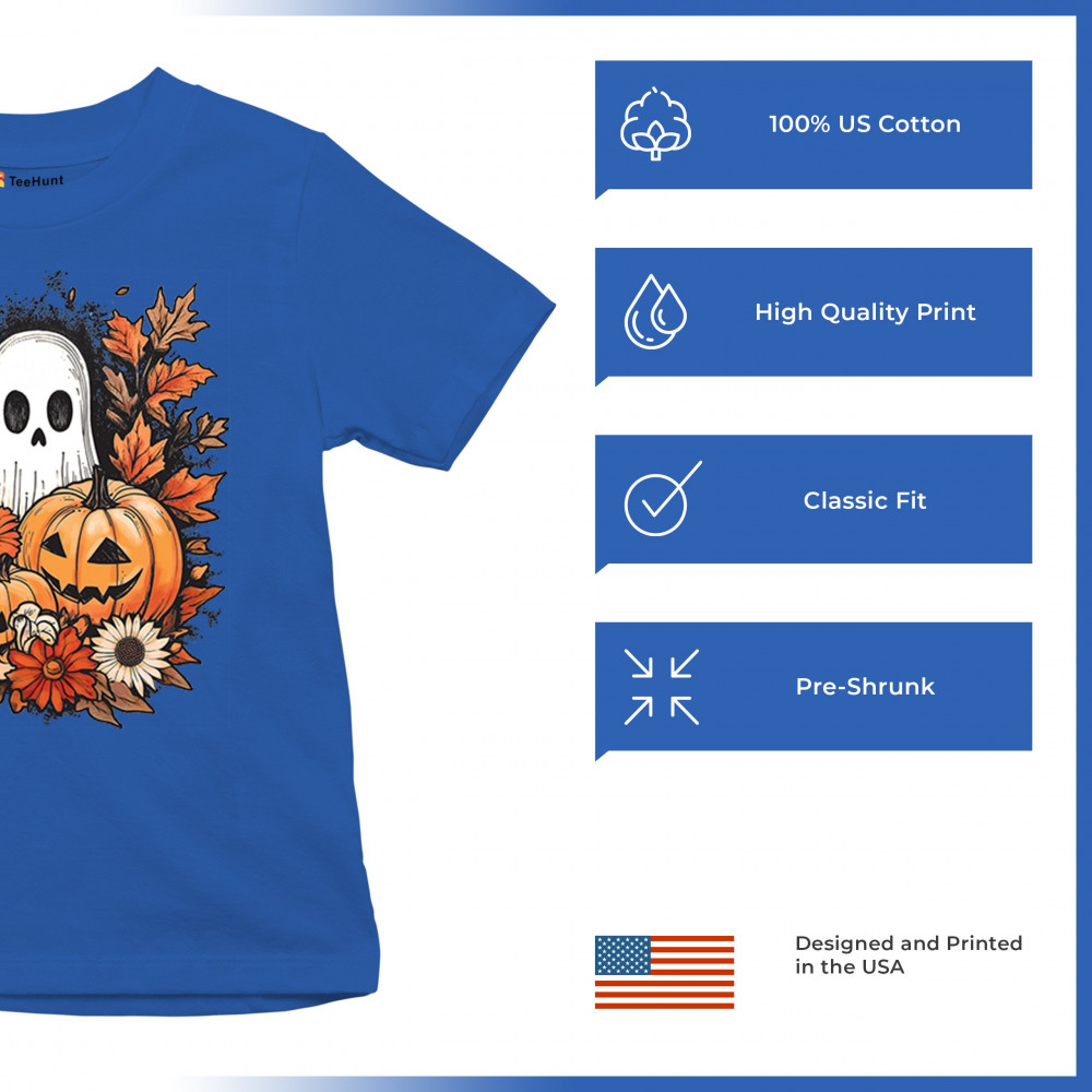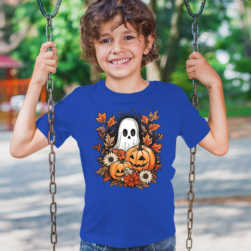 Celebrate the arrival of fall with this delightful design featuring pumpkins, autumn leaves, flowers, and a cute ghost. It's the perfect addition to your Halloween and autumn-themed wardrobe, or even as decor to welcome the fall spirit into your home. The combination of spooky and cozy elements creates a festive yet warm vibe, ideal for Halloween parties, pumpkin patch trips, or just enjoying the beautiful fall season.