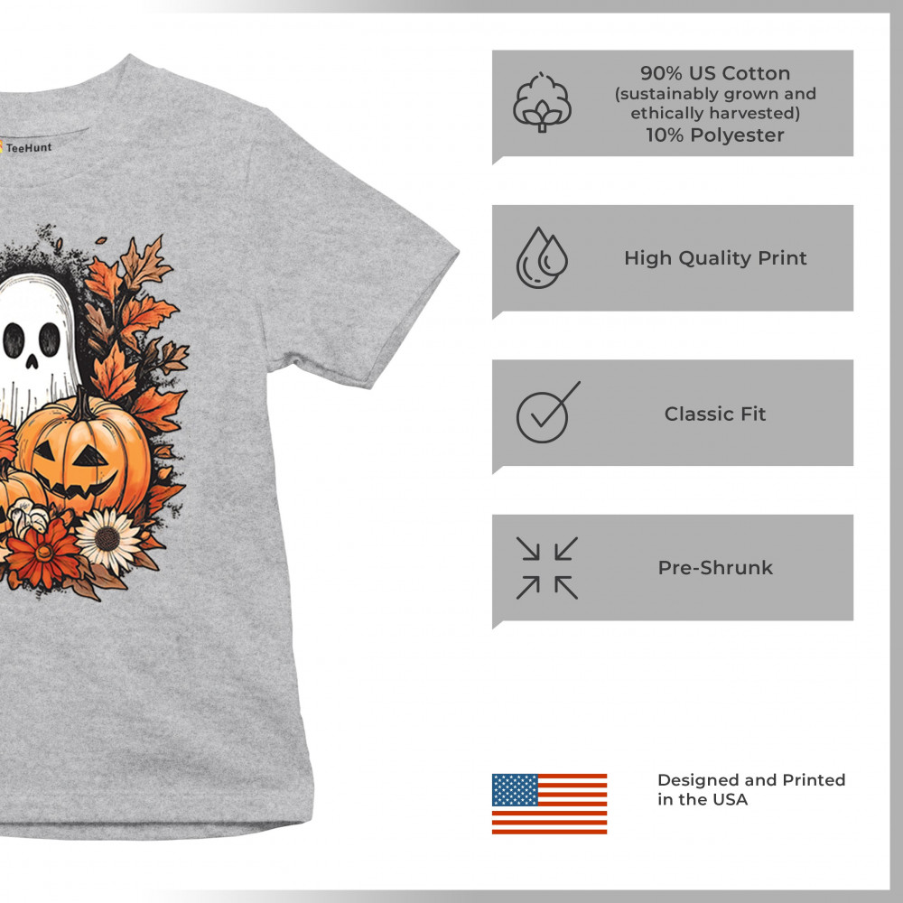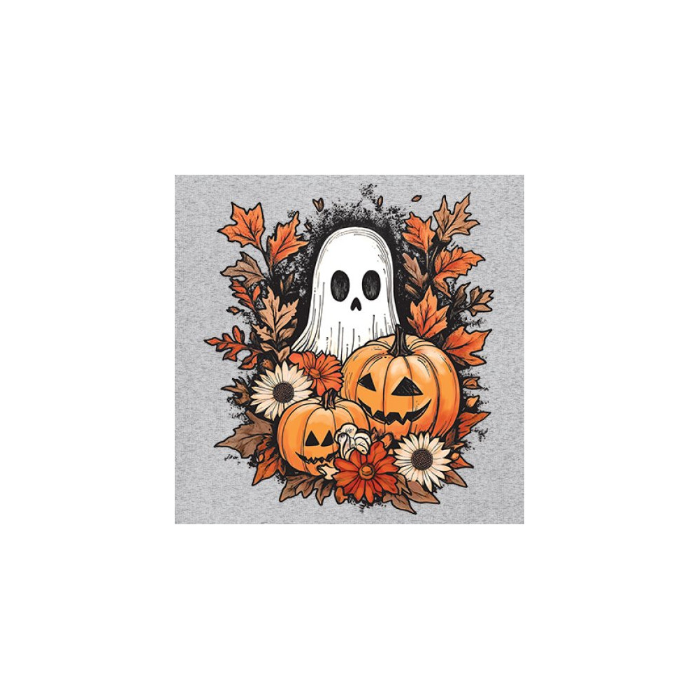 Celebrate the arrival of fall with this delightful design featuring pumpkins, autumn leaves, flowers, and a cute ghost. It's the perfect addition to your Halloween and autumn-themed wardrobe, or even as decor to welcome the fall spirit into your home. The combination of spooky and cozy elements creates a festive yet warm vibe, ideal for Halloween parties, pumpkin patch trips, or just enjoying the beautiful fall season.