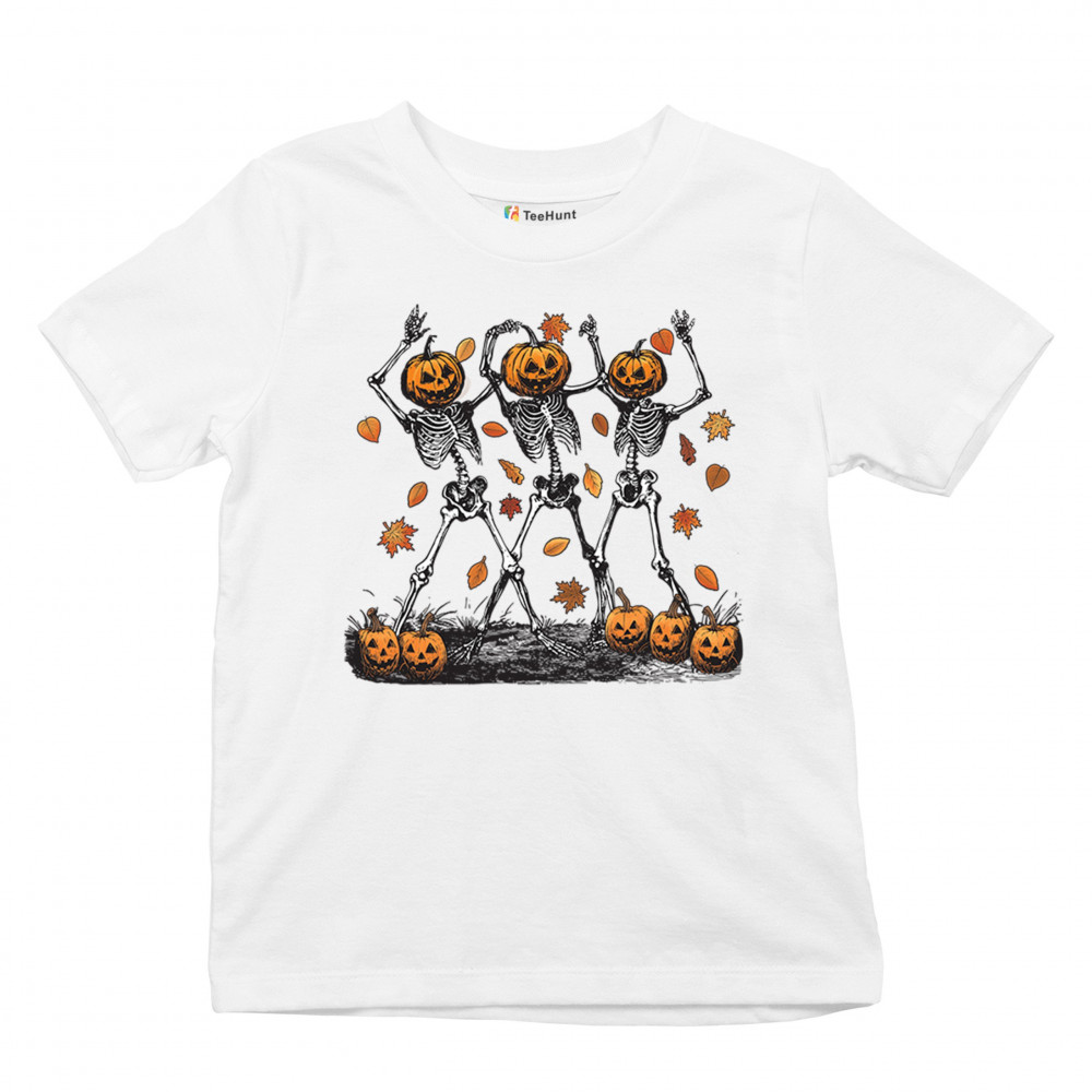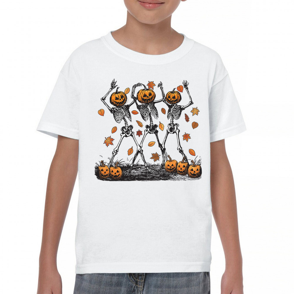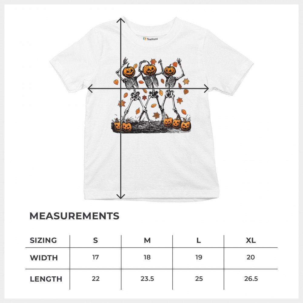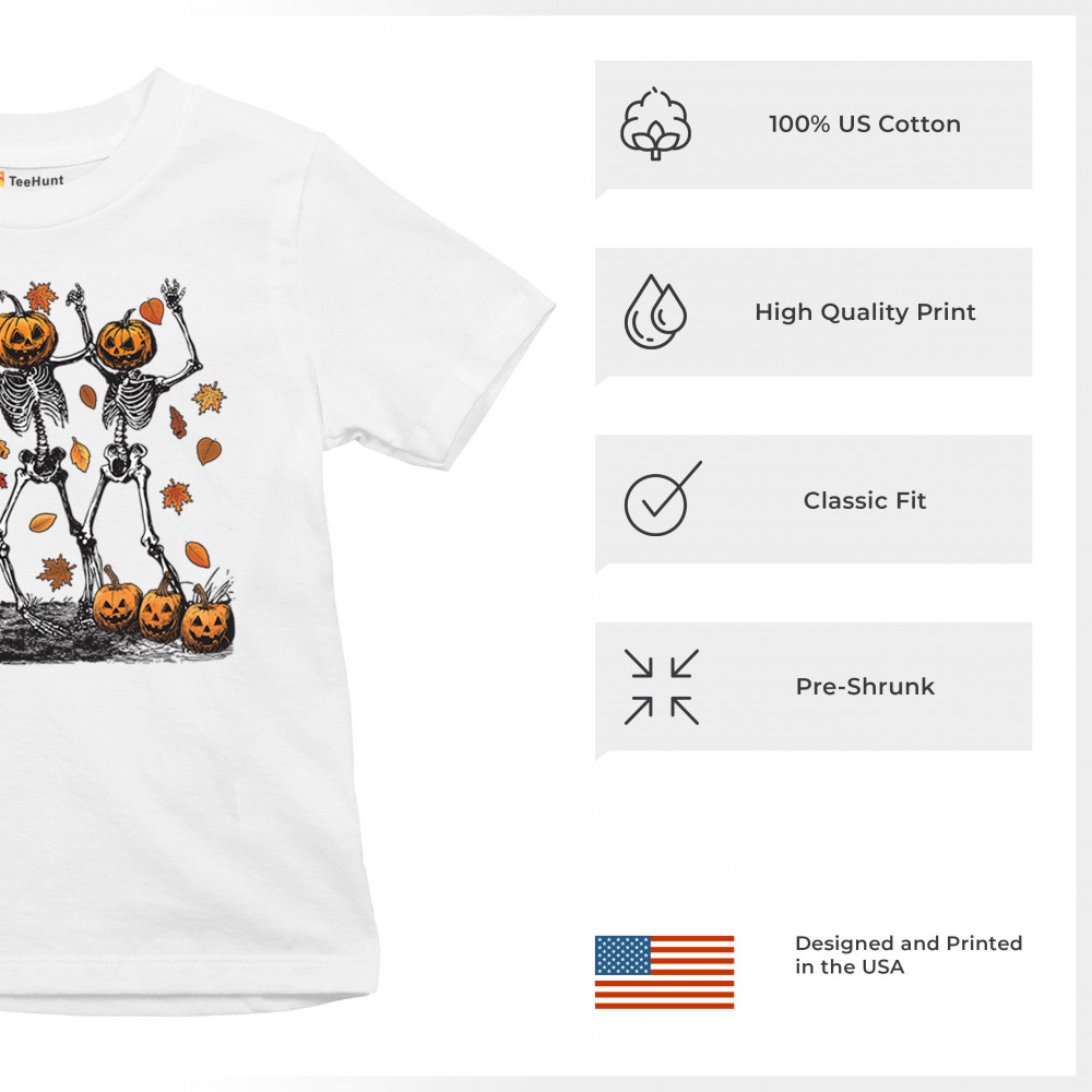 Add a touch of spooky fun to your wardrobe with this lively design featuring pumpkin-headed skeletons dancing through a swirl of autumn leaves. Perfect for Halloween parties, trick-or-treating, and fall festivals, this design is a must-have for anyone who enjoys the whimsical side of the spooky season. Made with comfort and quality in mind, this is the perfect apparel for all your October gatherings and events. Wear it to show off your Halloween spirit!