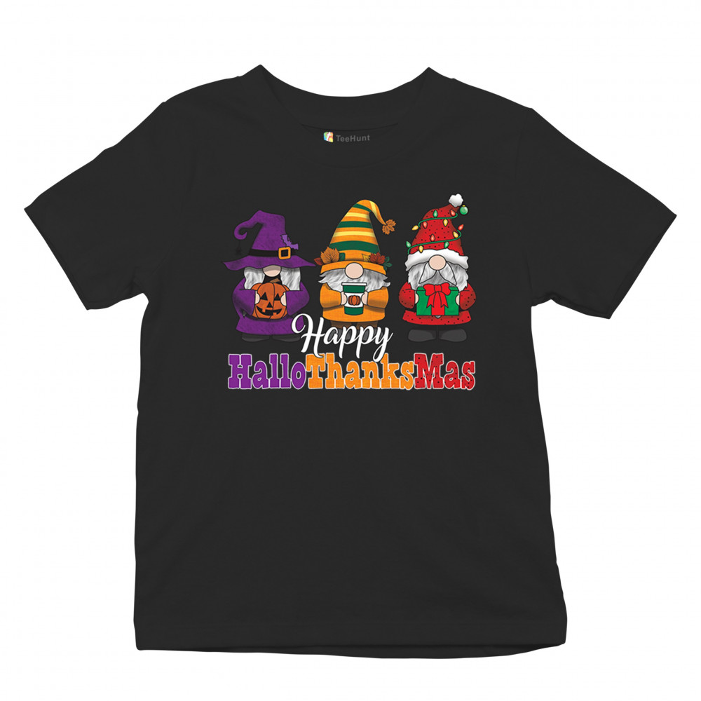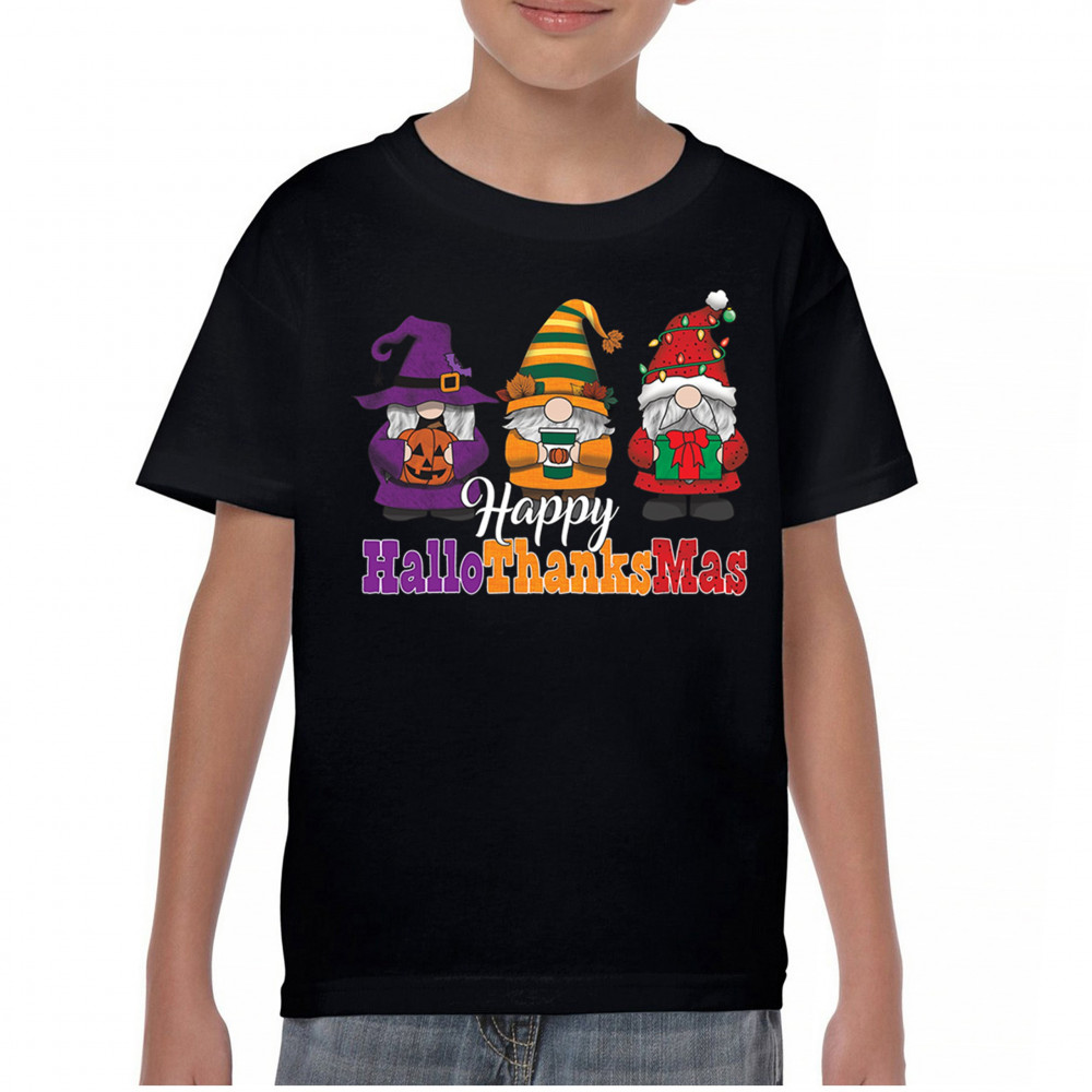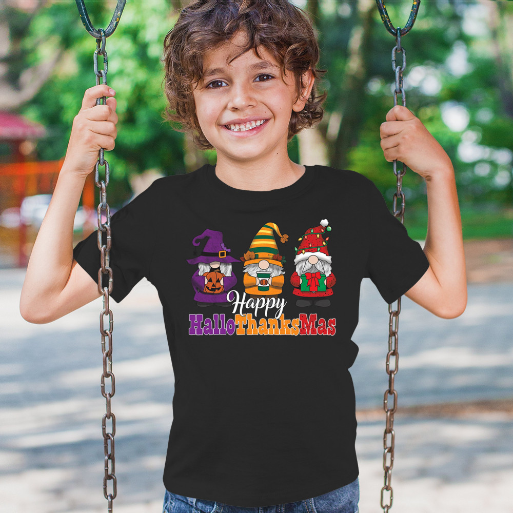 HALLOWTHANKSMAS youth t-shirt gnomes halloween thanksgiving christmas kids black