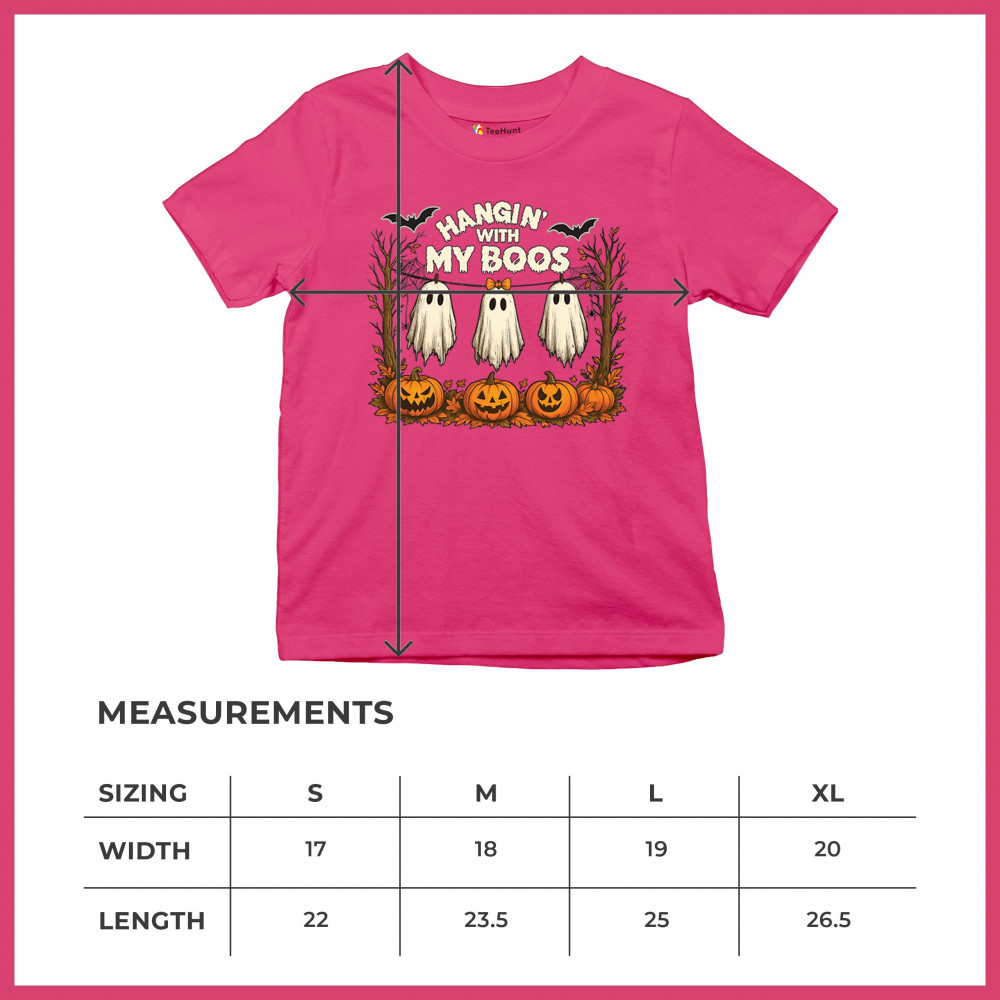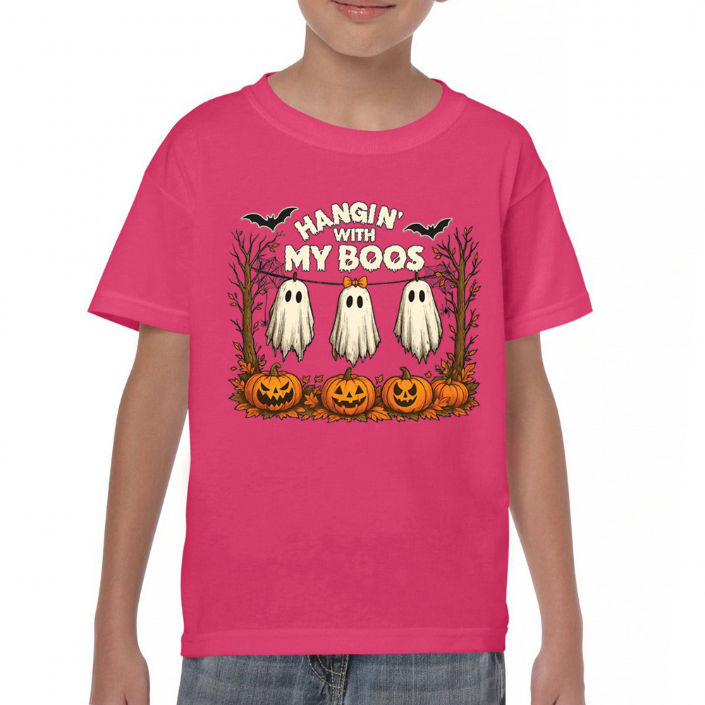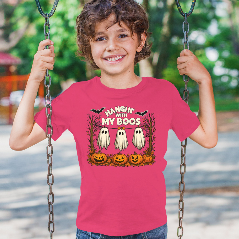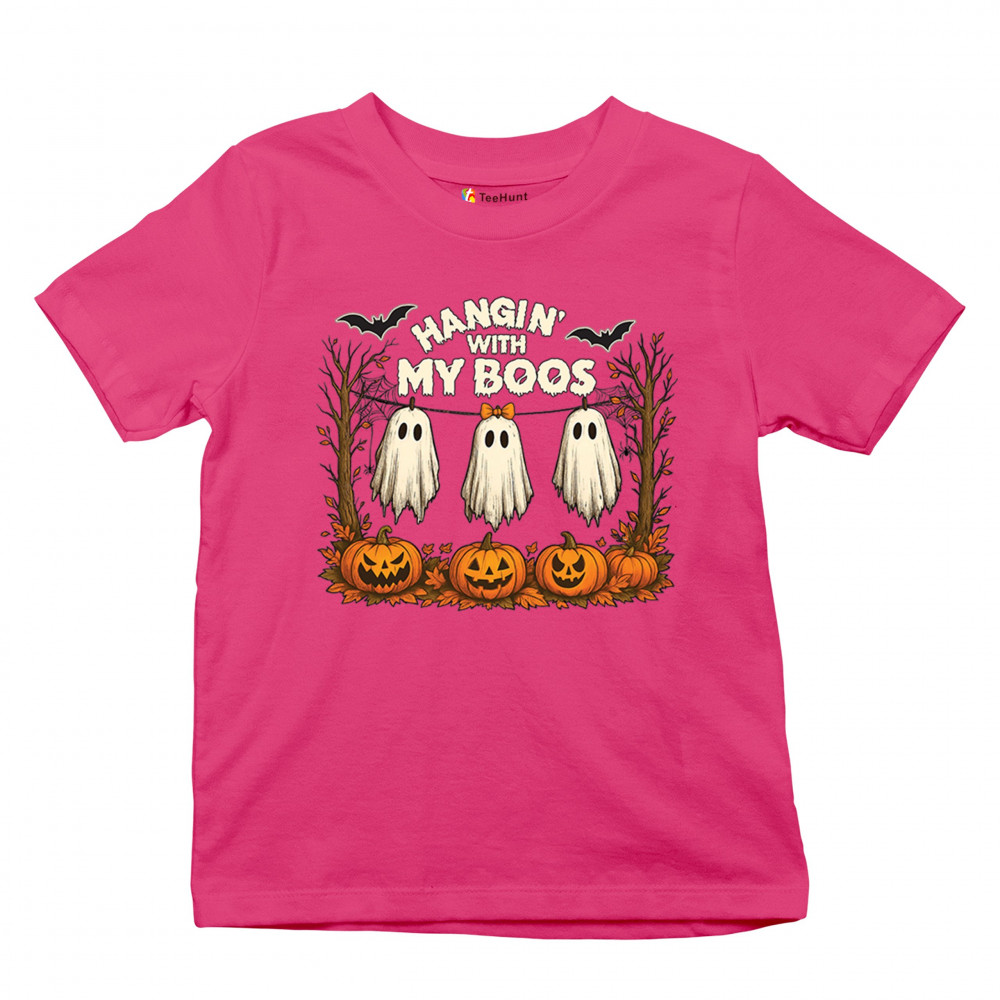 Hangin With My Boos design featuring spooky ghosts, jack o lanterns, and haunted house humor. Perfect for Halloween night, October 31, and parties.