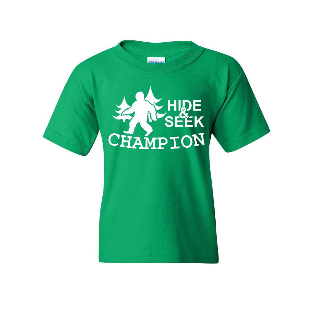 HIDE AND SEEK CHAMPION youth t-shirt bigfoot yeti funny humor kids tee green
