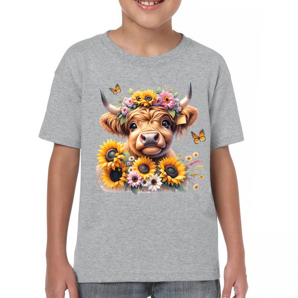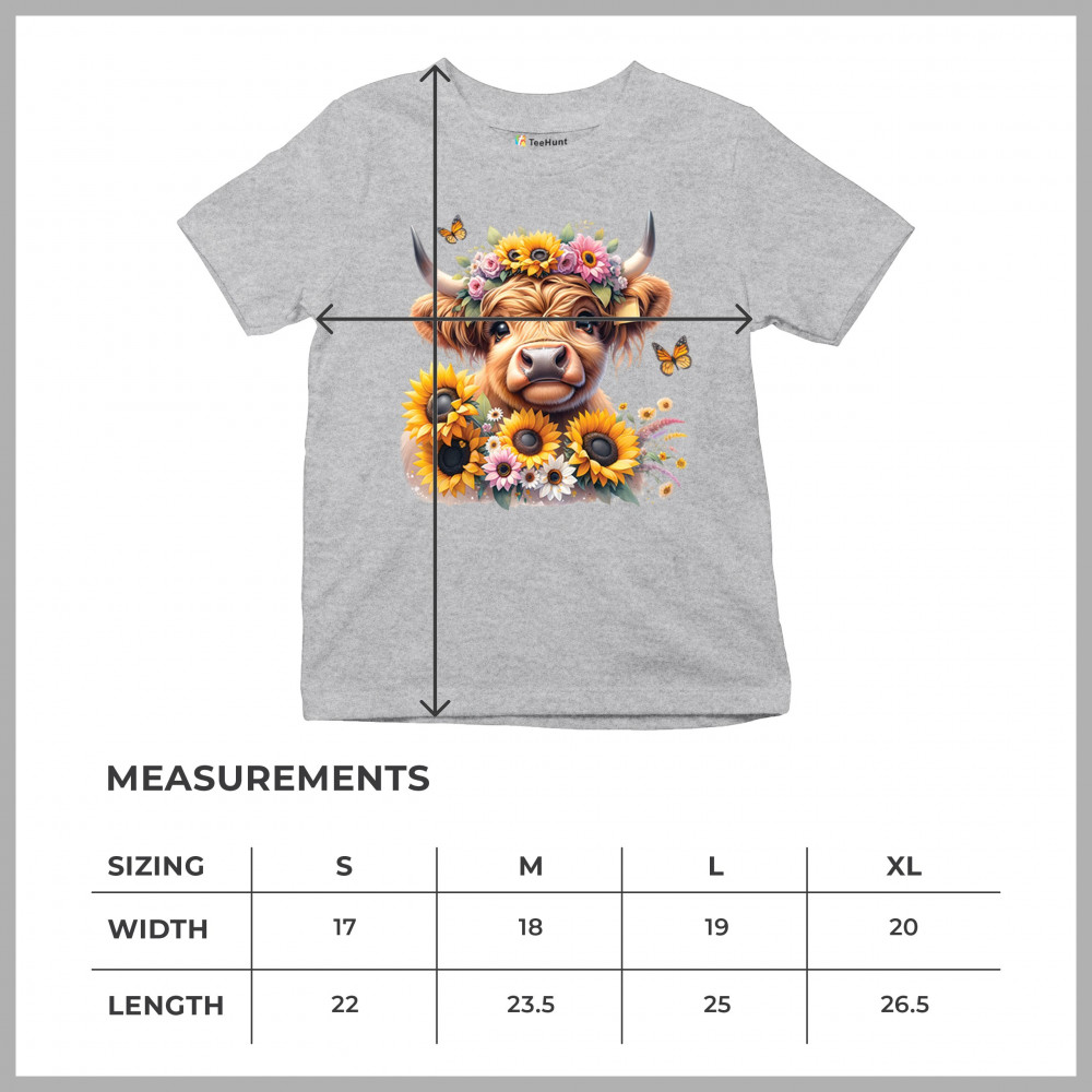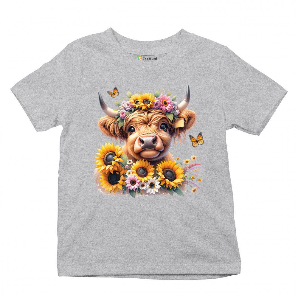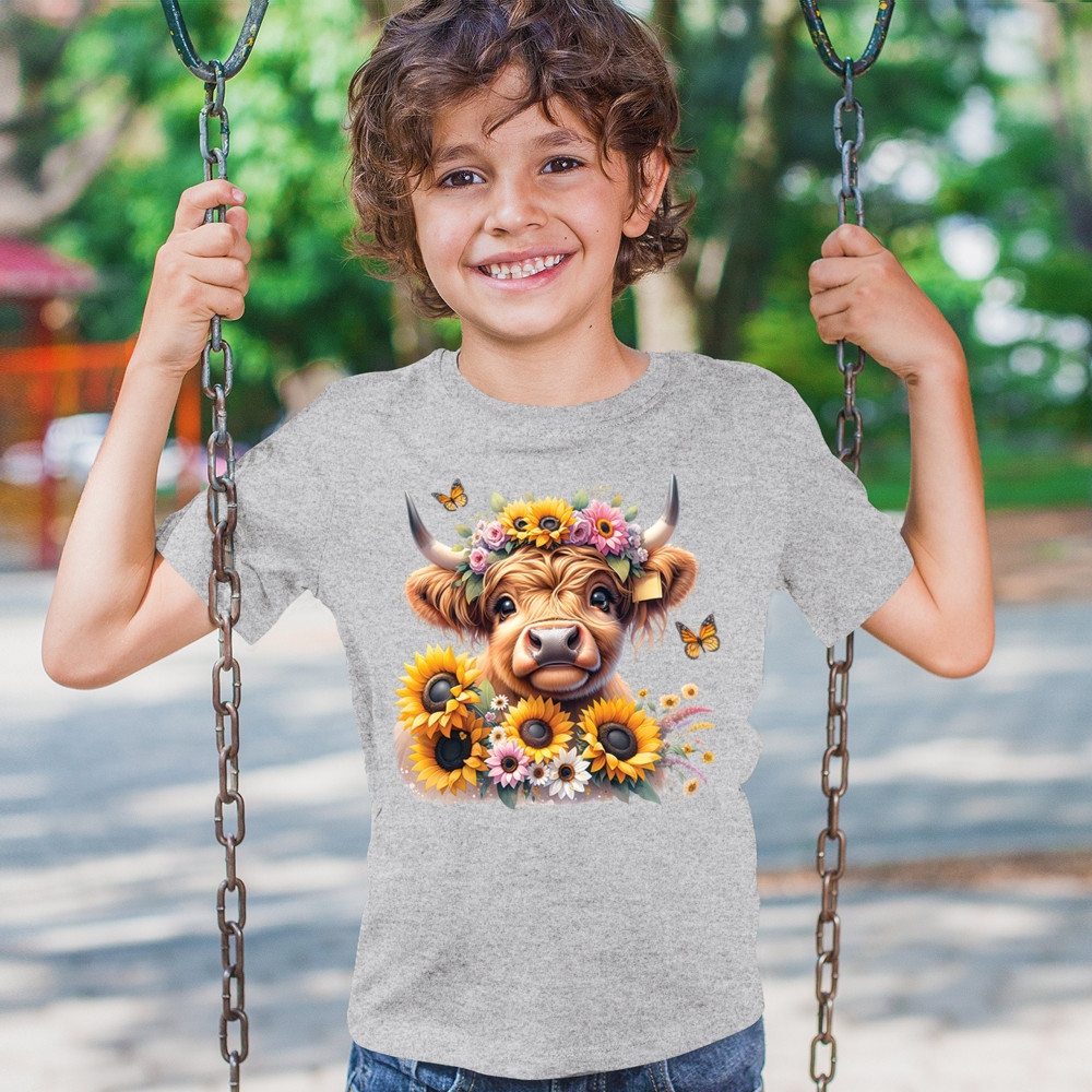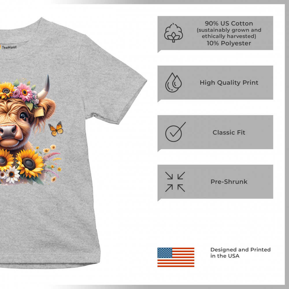 Highland Cow floral design with sunflowers and daisies, rustic farmhouse cow style, western ranch boho charm, and cozy country farmhouse shirt vibes.