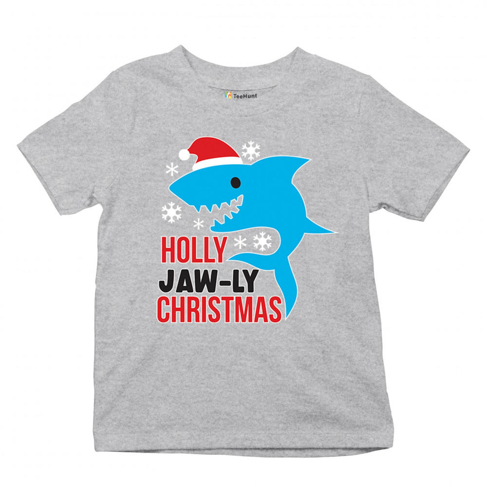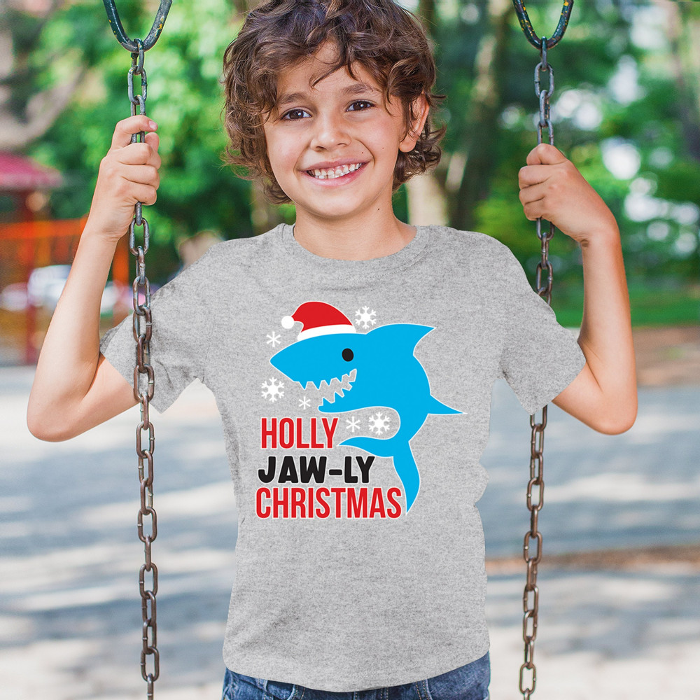 Funny Holly Jaw-ly Christmas shark pun design with Santa hat and snowflakes. Perfect for ocean lovers, festive parties, and cheerful holiday fun.