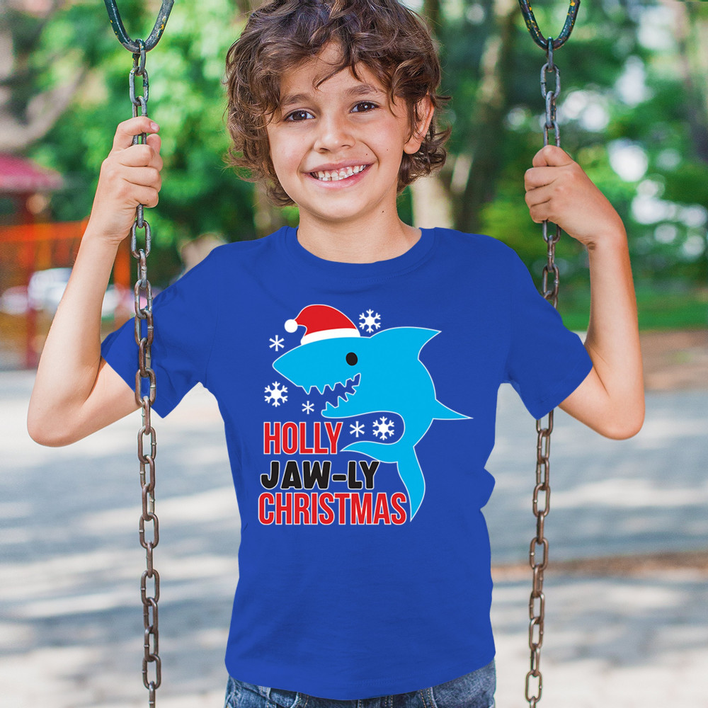 Funny Holly Jaw-ly Christmas shark pun design with Santa hat and snowflakes. Perfect for ocean lovers, festive parties, and cheerful holiday fun.
