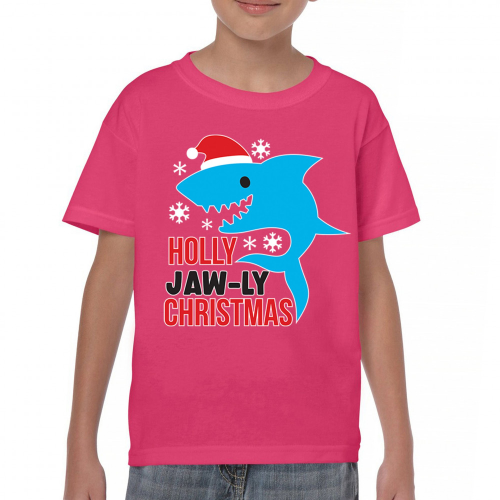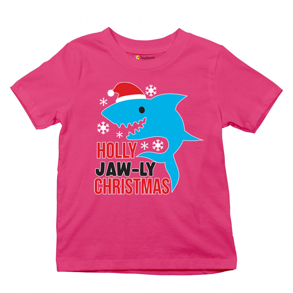 Funny Holly Jaw-ly Christmas shark pun design with Santa hat and snowflakes. Perfect for ocean lovers, festive parties, and cheerful holiday fun.