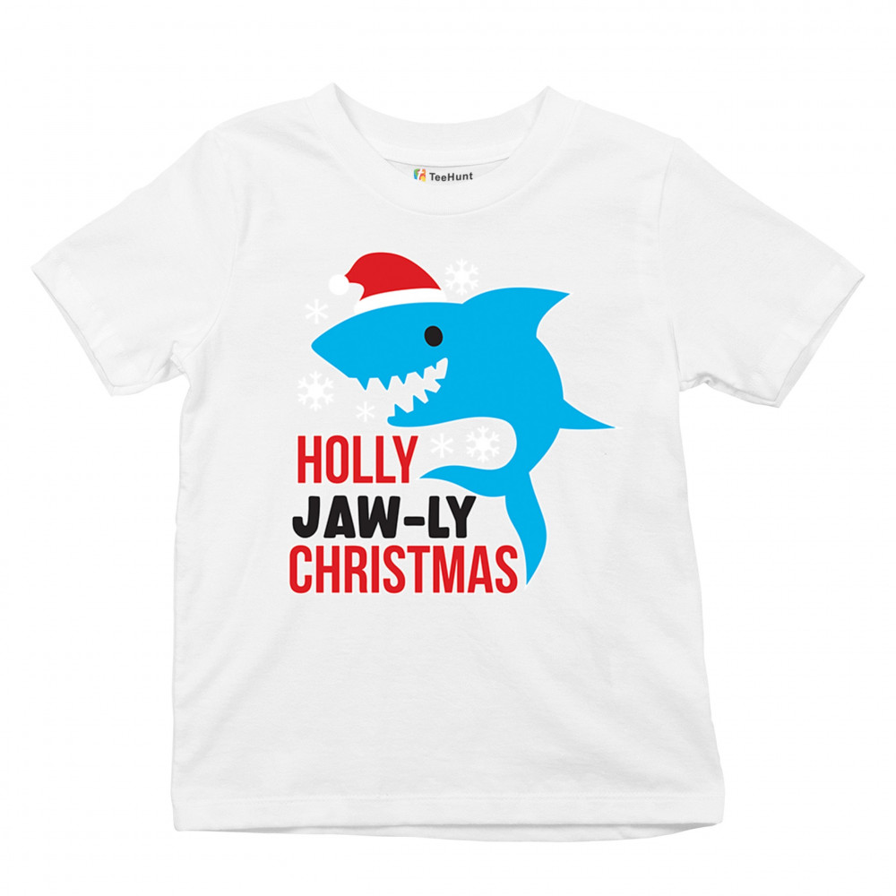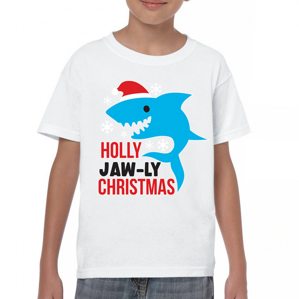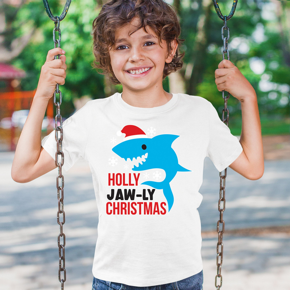 Funny Holly Jaw-ly Christmas shark pun design with Santa hat and snowflakes. Perfect for ocean lovers, festive parties, and cheerful holiday fun.