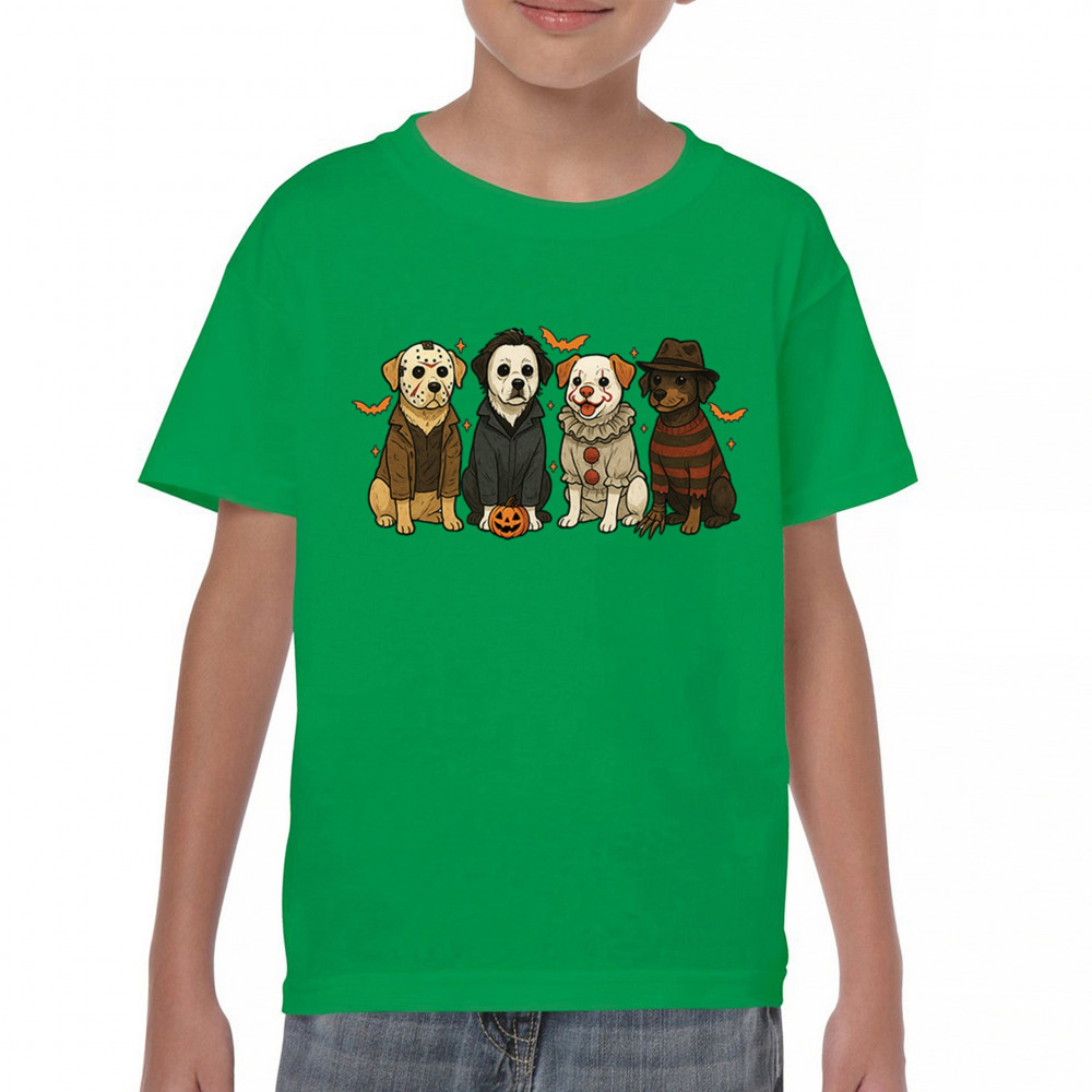 Horror Dogs Halloween design with creepy costumes, pumpkin heads, and haunted house vibes. Perfect for October 31, autumn nights, and scary fun.