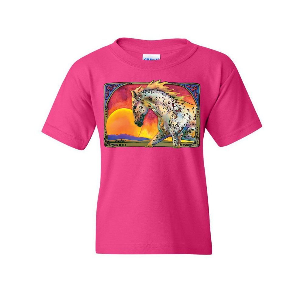 HORSE PRANCING IN SUNSET youth t-shirt animal wildlife mare stallion kids tee hot pink