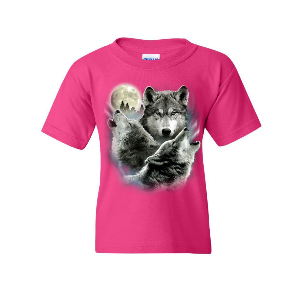 WOLF PACK HOWLING UP TO THE MOON howling wolf pack youth t-shirt wild wilderness animals nature moon kids tee pink
