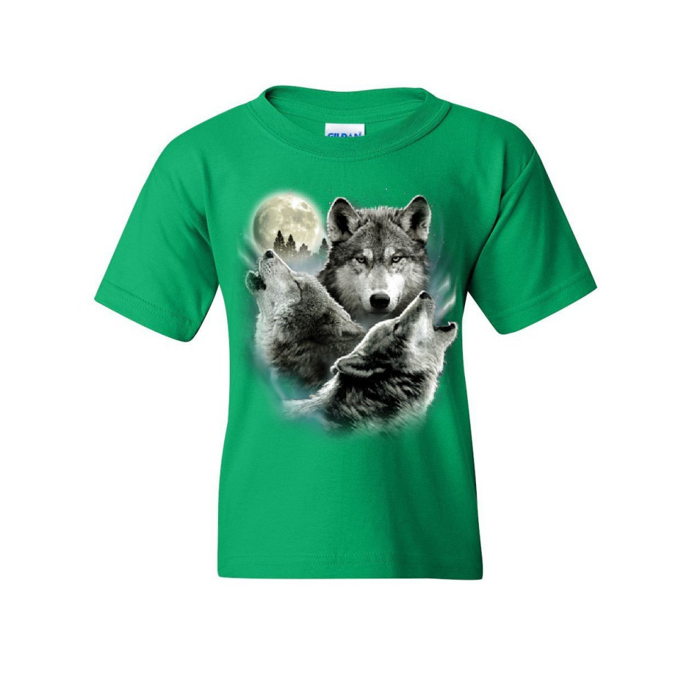 WOLF PACK HOWLING UP TO THE MOON howling wolf pack youth t-shirt wild wilderness animals nature moon kids tee green