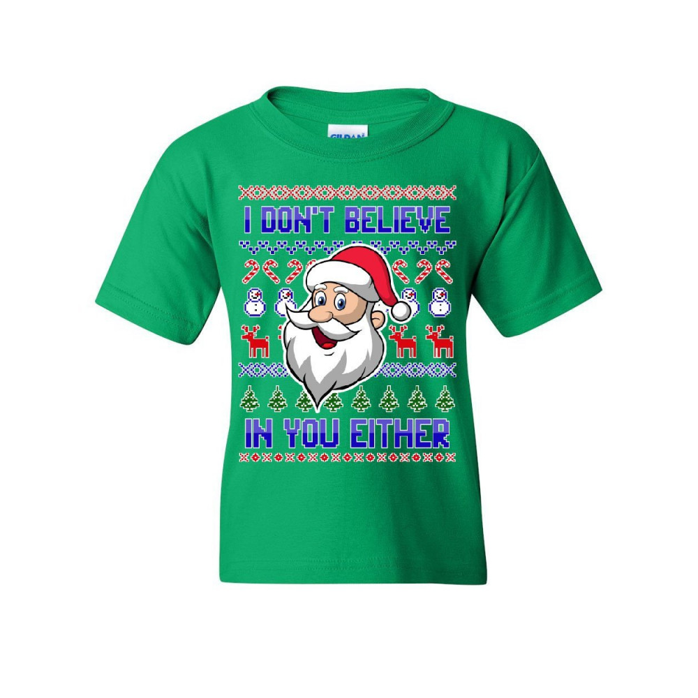 I DON'T BELIEVE IN YOU EITHER youth t-shirt christmas xmas santa ugly kids tee green