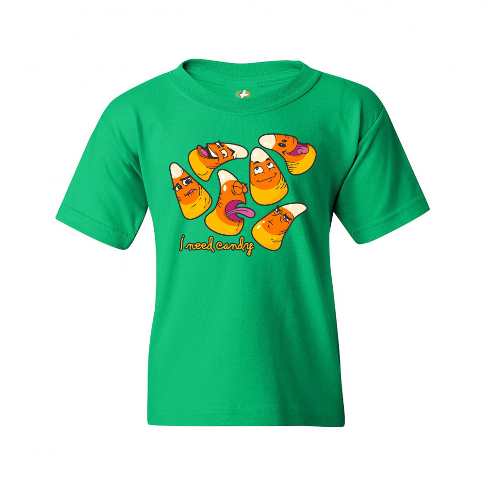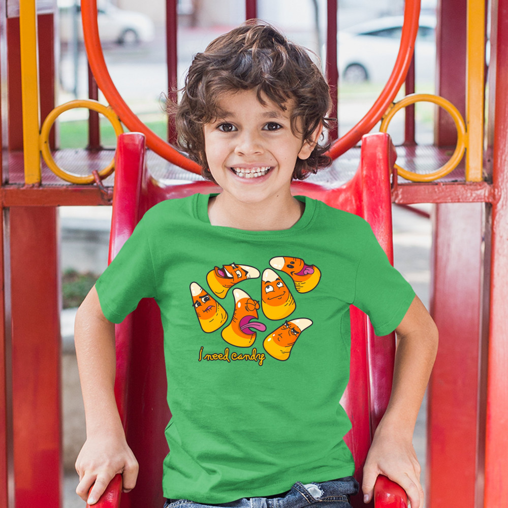 I NEED CANDY youth t-shirt happy halloween trick-or-treating funny kids green