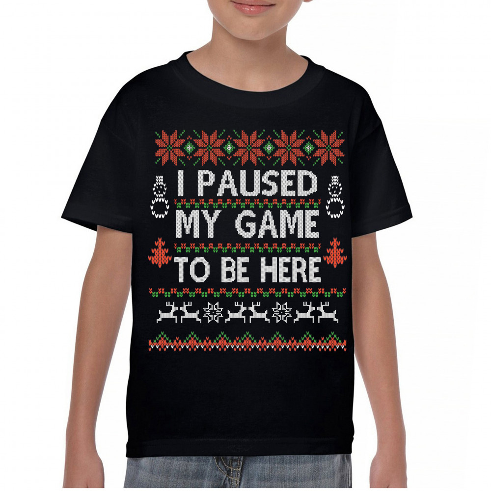 I PAUSED MY GAME TO BE HERE UGLY SWEATER THEME youth t-shirt christmas kids black