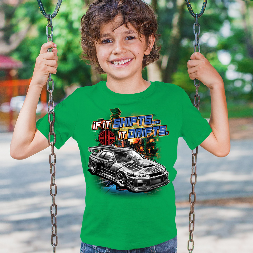 "If It Shifts, It Drifts" design. Perfect for car enthusiasts, featuring a detailed car and vibrant cityscape. Comfortable, durable, and stylish.