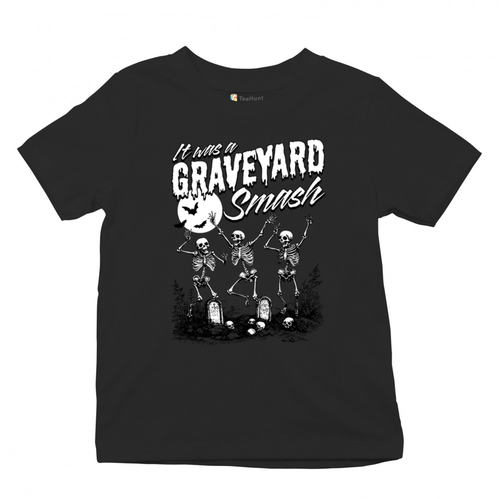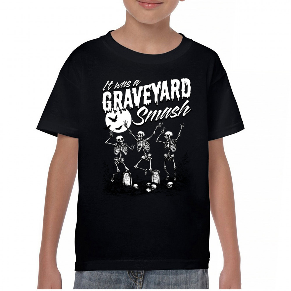 IT WAS A GRAVEYARD SMASH HALLOWEEN SKELETON youth t-shirt pumpkin skull kids black
