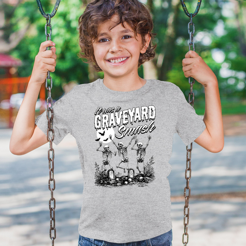 Celebrate Halloween with a fun "Graveyard Smash" design featuring dancing skeletons. Perfect for parties and haunted house events!