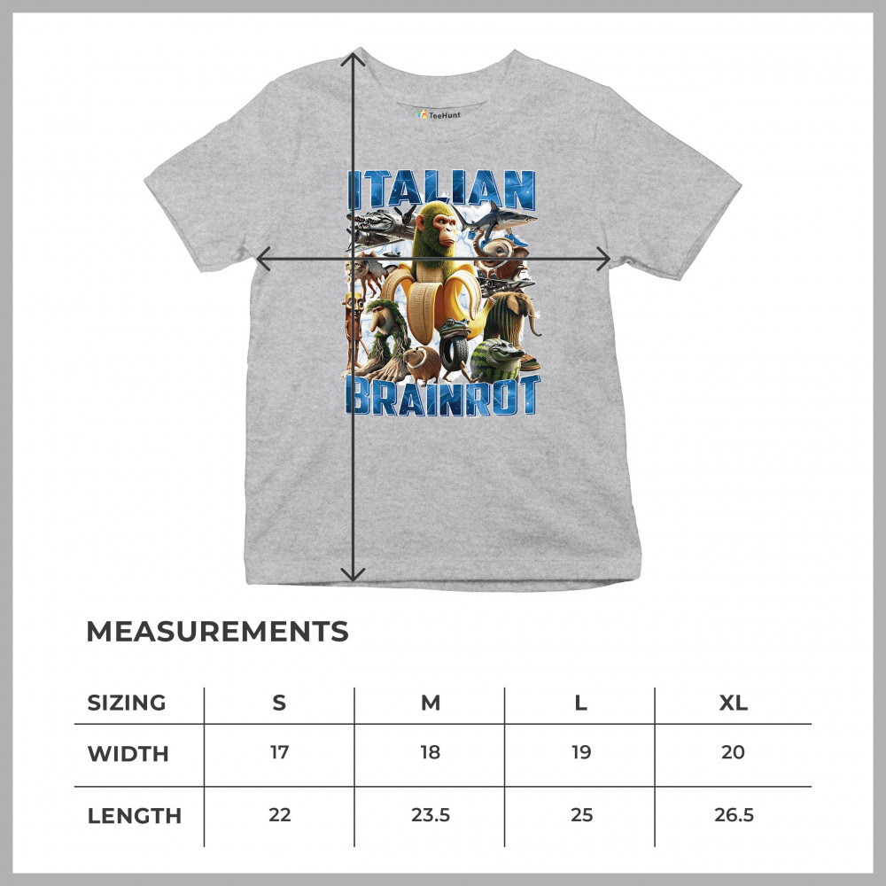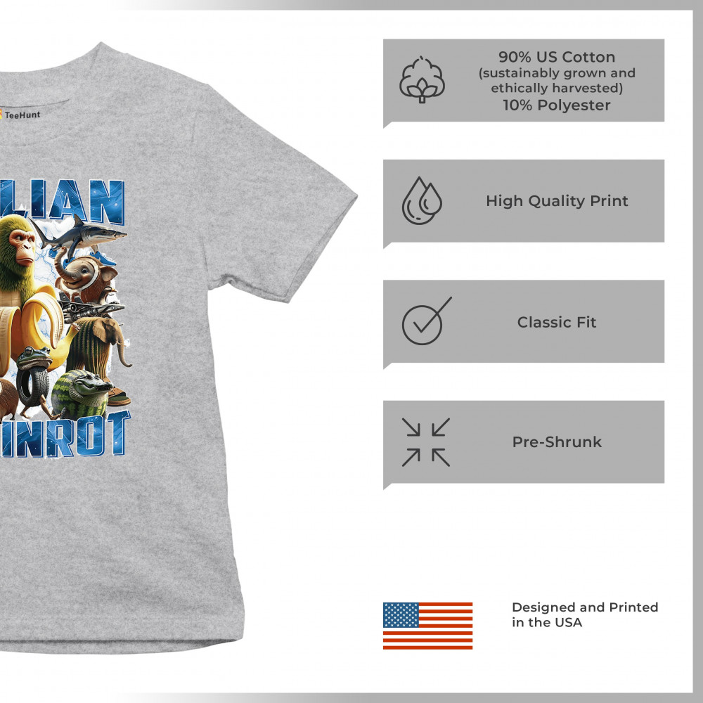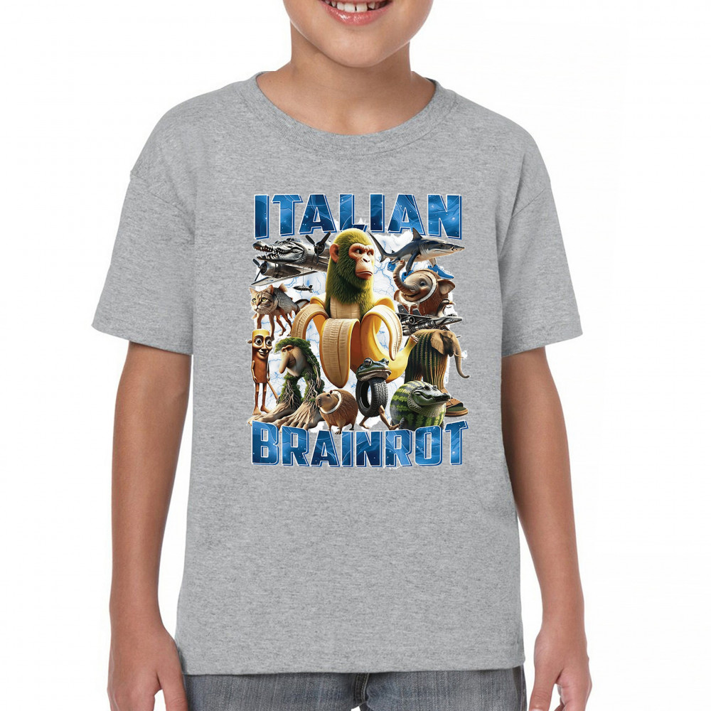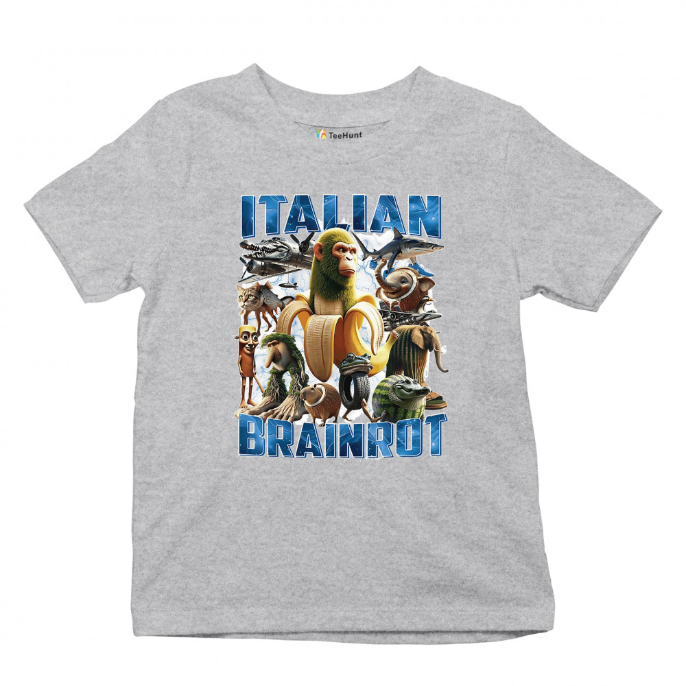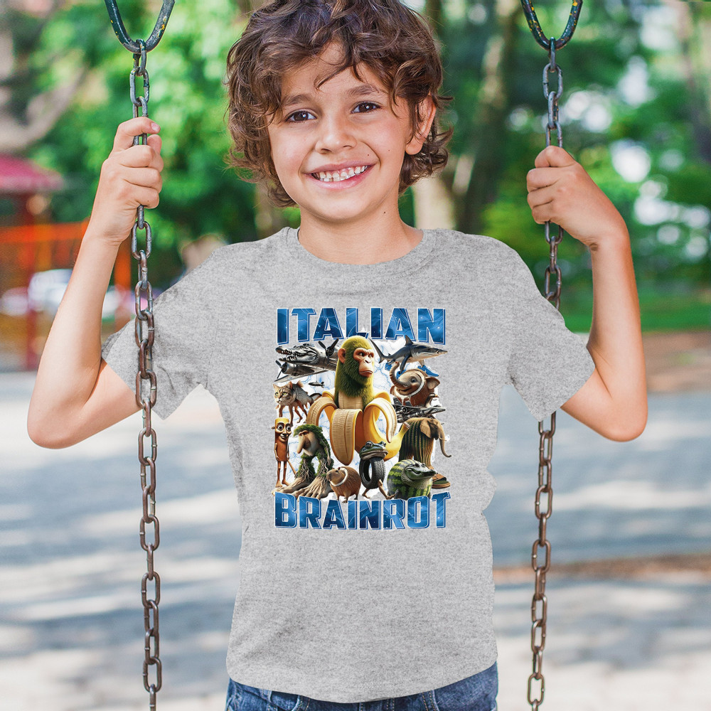 This design captures the full force of Italian brainrot—bananas, sharks, monkeys, and meme beasts collide in an unfiltered internet-core explosion. Perfect for fans of cursed humor, Gen Z trends, absurd fashion, TikTok memes, ironic style, surreal pop art, chaotic culture, digital nonsense, Gen Alpha brainrot, and hyper-online energy.