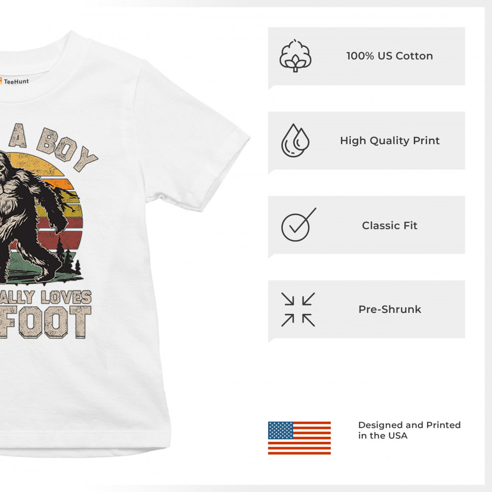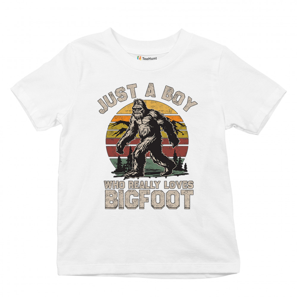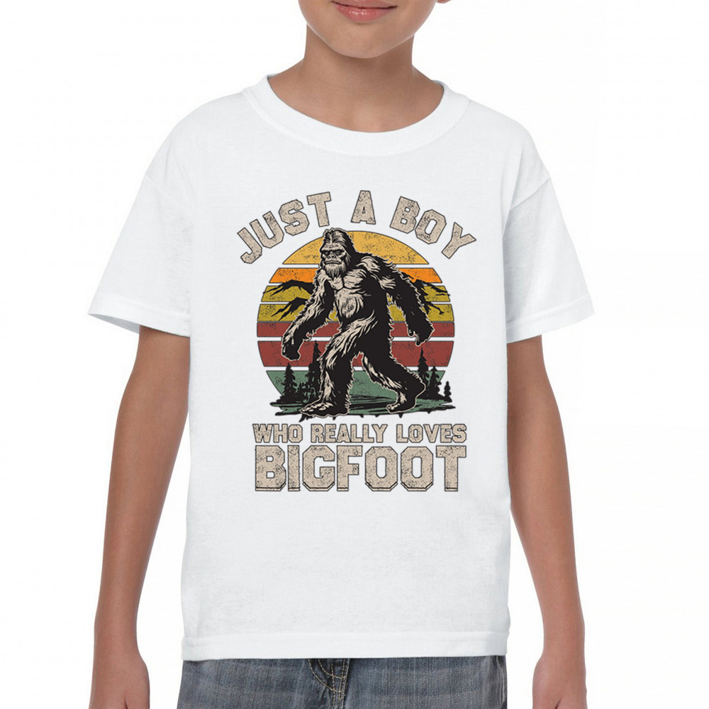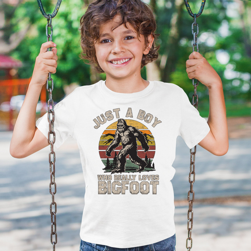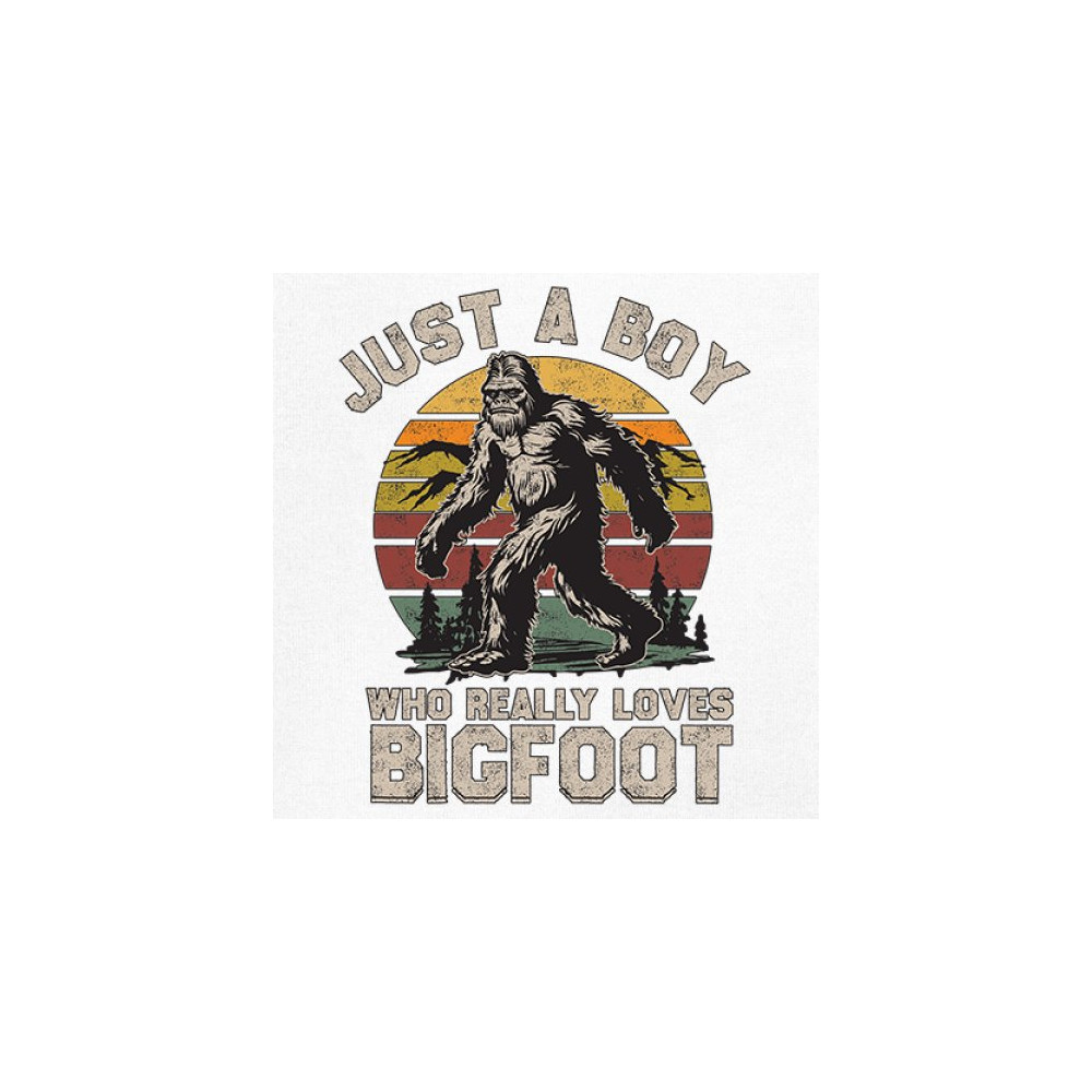 Celebrate Bigfoot love with this retro "Just a Boy Who Really Loves Bigfoot" design—perfect for cryptid fans and outdoor adventurers alike!