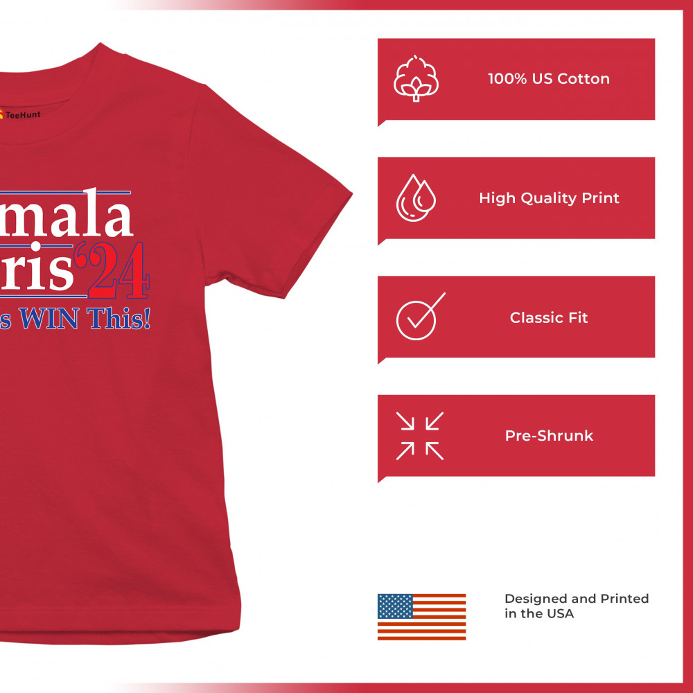 Express your support for Kamala Harris and her campaign with this striking design. The bold text and patriotic colors of red, white, and blue make it perfect for rallies, elections, and everyday wear. Showcasing Kamala Harris's name and the motivational slogan "Let's WIN This!", this graphic is an essential for any anti-Trump supporter, liberal, or Democrat. Join the movement to elect the first female president and demonstrate your commitment to progressive values and a brighter future for America.