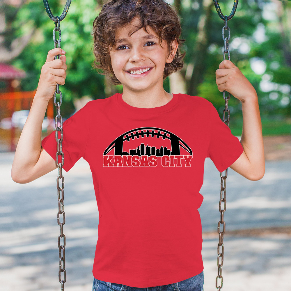 Celebrate Kansas City with a bold football design featuring the city skyline. Perfect for game days, tailgates, or proud sports fans.
