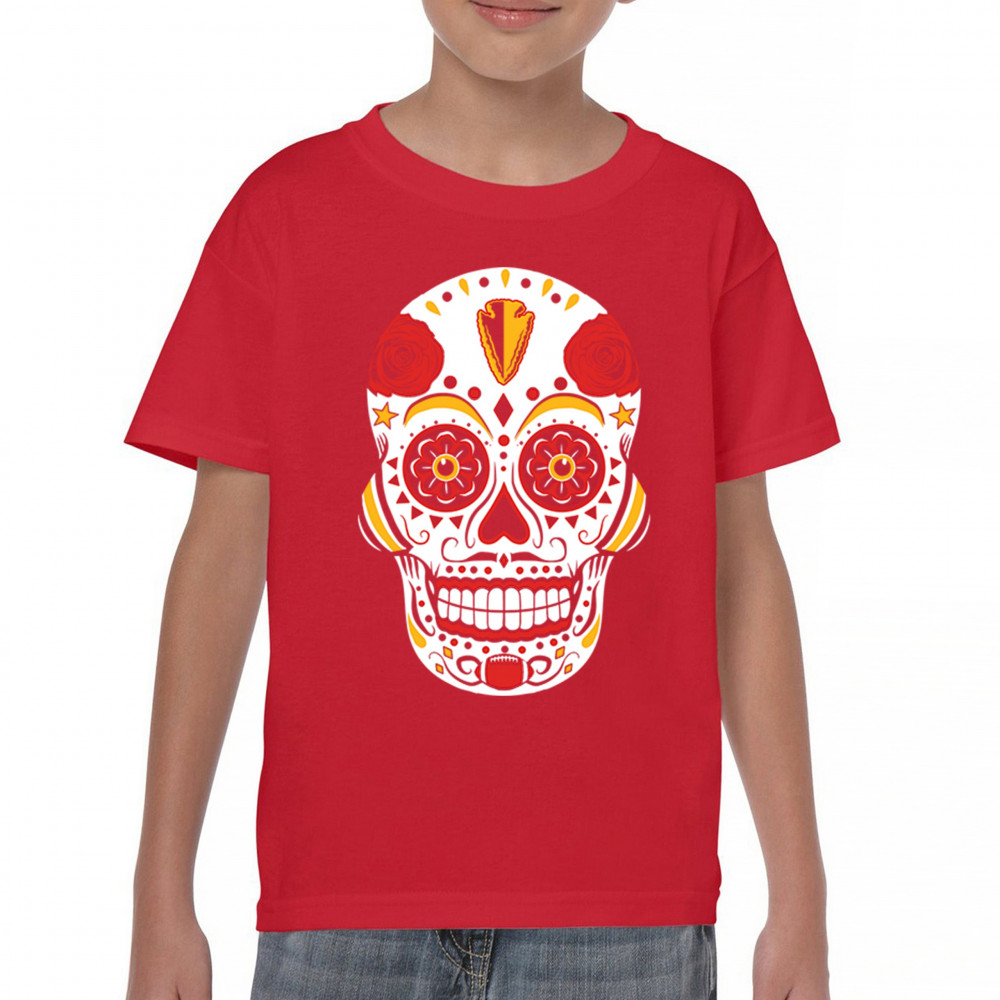 Kansas Sugar Skull with Heart of America pride, red & gold tradition, City of Fountains identity, playoff vibes, and Game Day spirit.