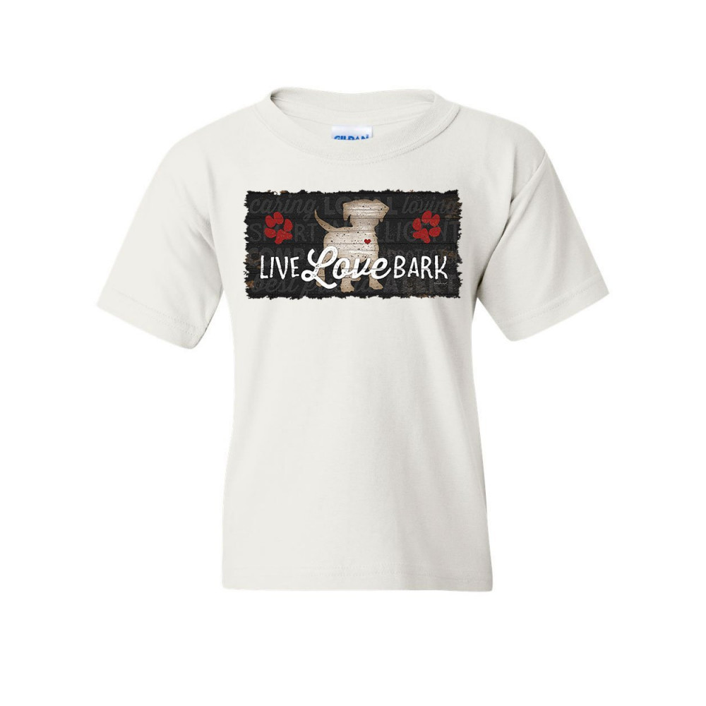 LIVE LOVE BARK youth t-shirt cute dog puppy doggie paw wiggle pet woof kids tee white