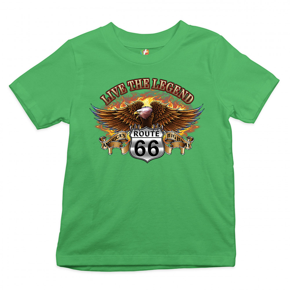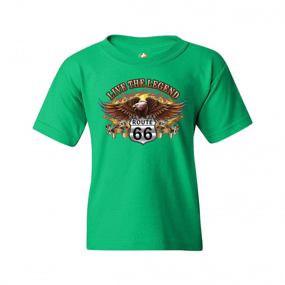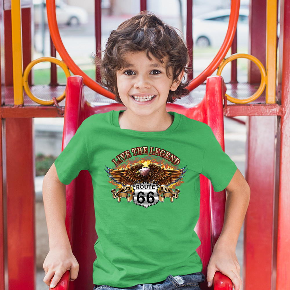 LIVE THE LEGEND AMERICA'S HIGHWAYS youth t-shirt route 66 bald eagle kids green