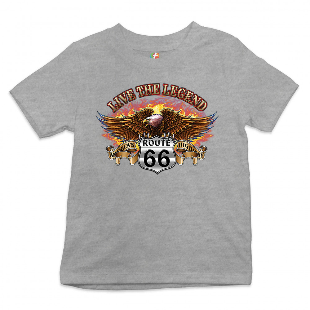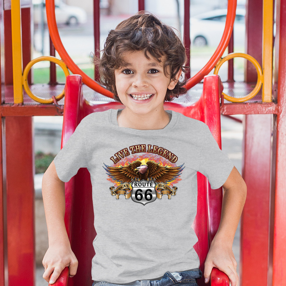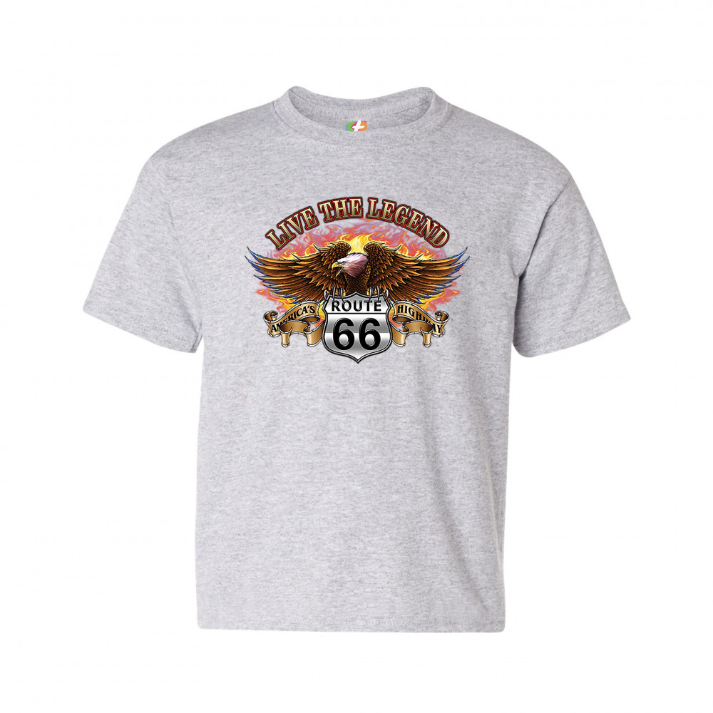 LIVE THE LEGEND AMERICA'S HIGHWAYS youth t-shirt route 66 bald eagle kids gray