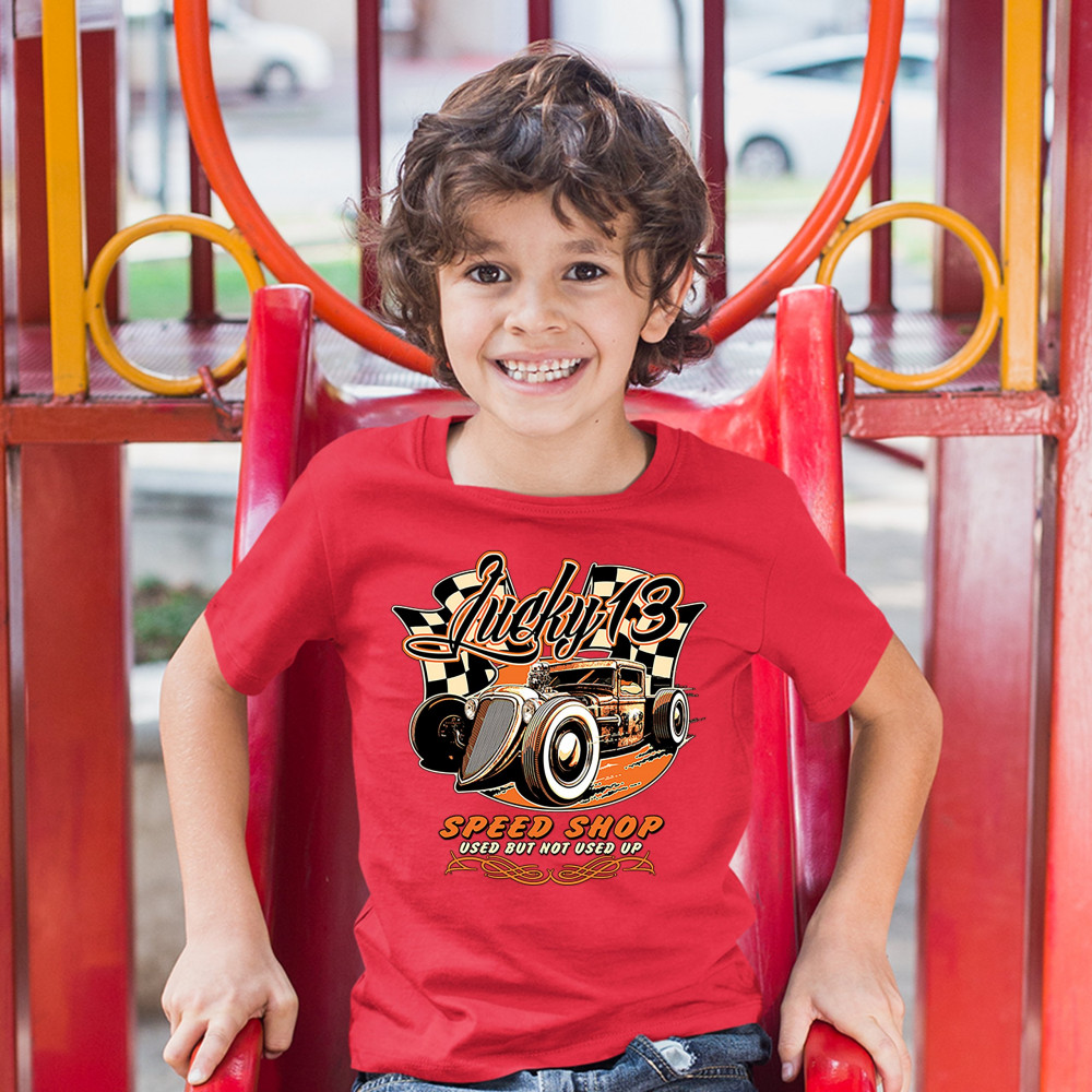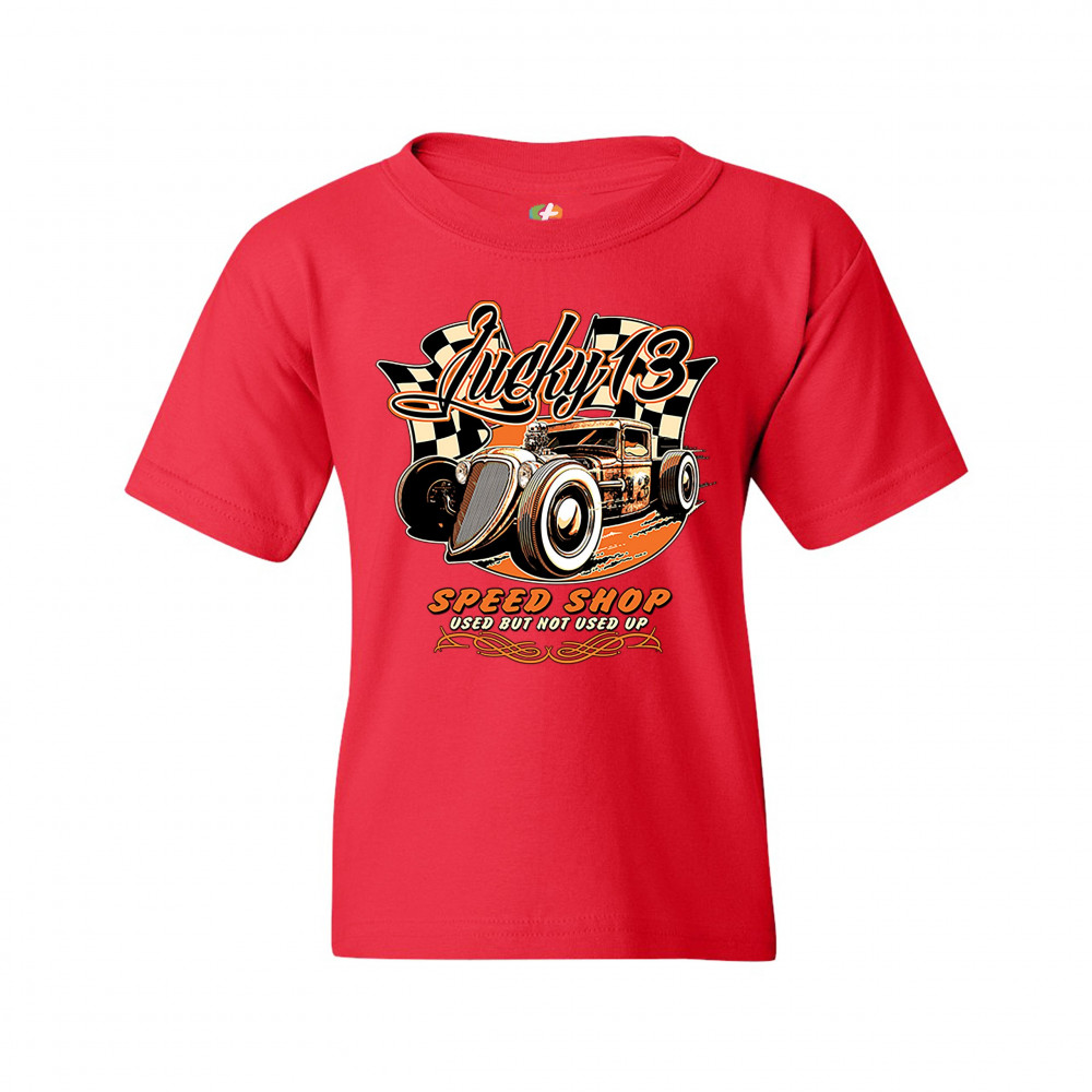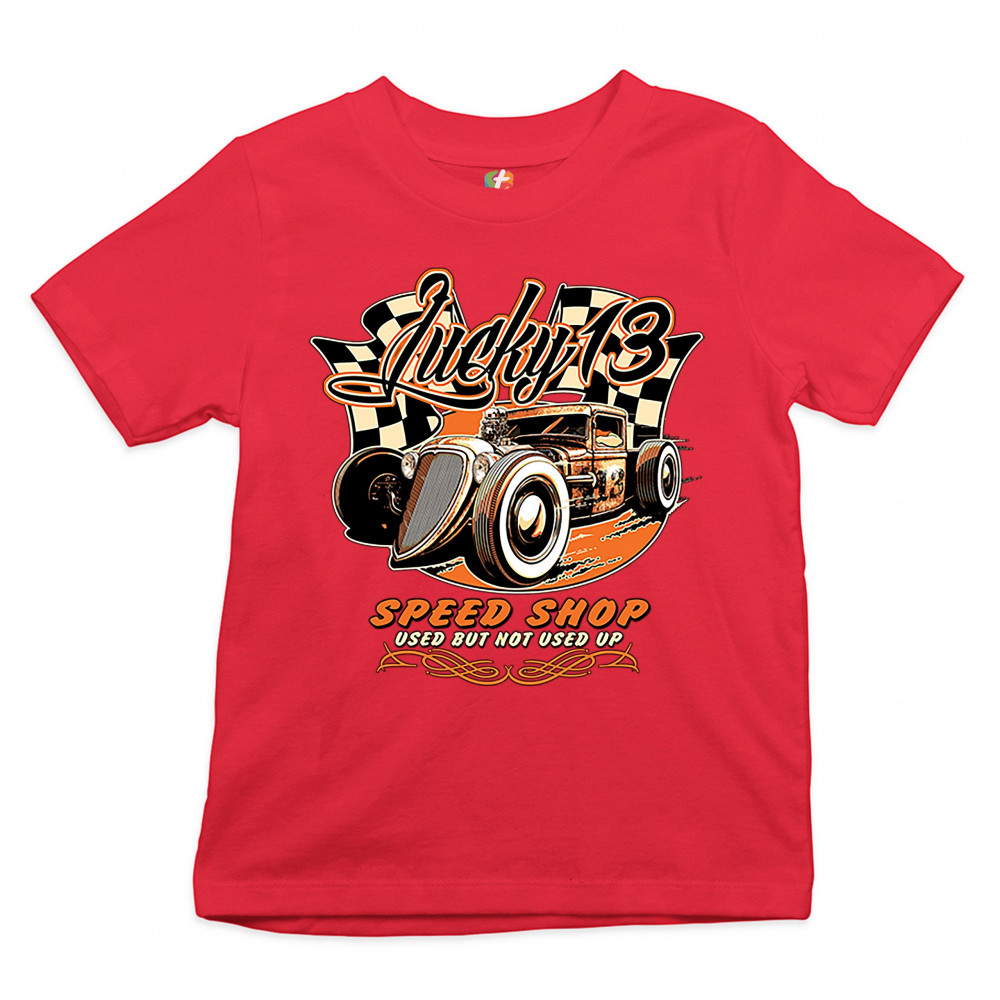 LUCKY 13 SPEED SHOP youth t-shirt rat rod route 66 vintage racing car kids red