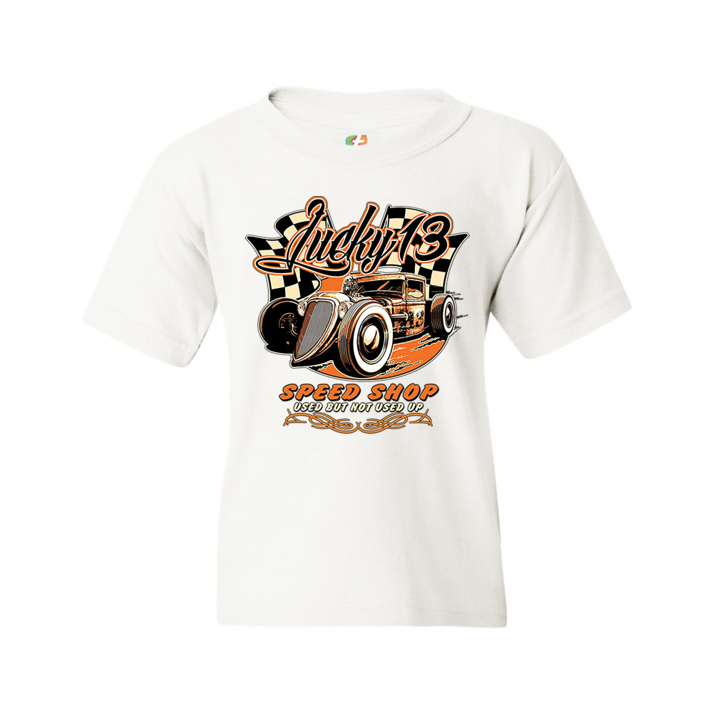 LUCKY 13 SPEED SHOP youth t-shirt rat rod route 66 vintage racing car kids white