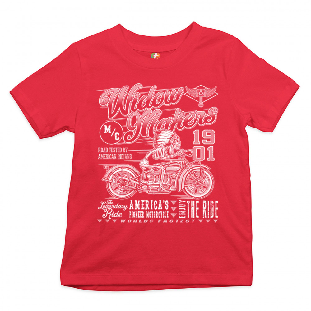 A print featuring a skeleton wearing a native American warbonnet and riding a bobber motorcycle. There is also a logo with a winged piston in the top right corner. The print says: "M/C Widowmakers 1901, road tested by American Indians, the legendary ride,
