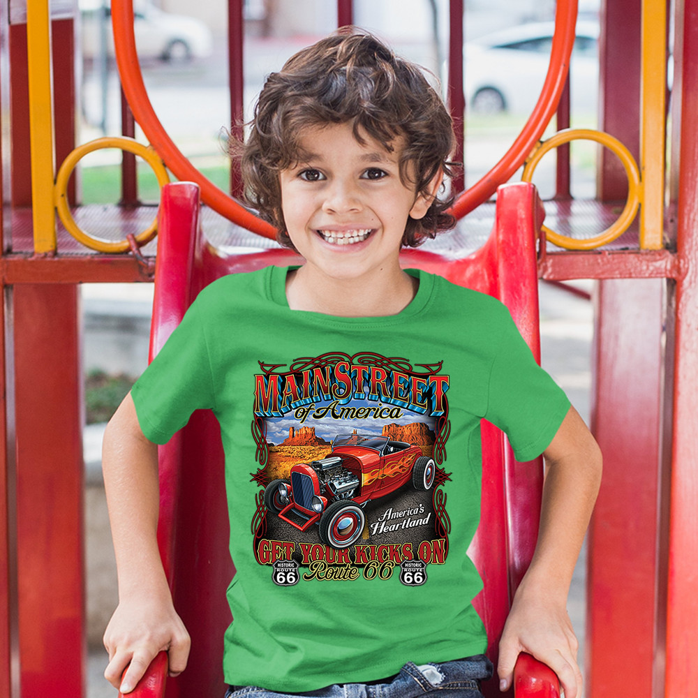 A print featuring a vintage hot rod with an exposed engine and flame paint job parked on a highway. The print says: "Main Street of America", "America's Heartland" and "Get Your Kicks on Route 66". The print also features two Route 66 signs. A great choic