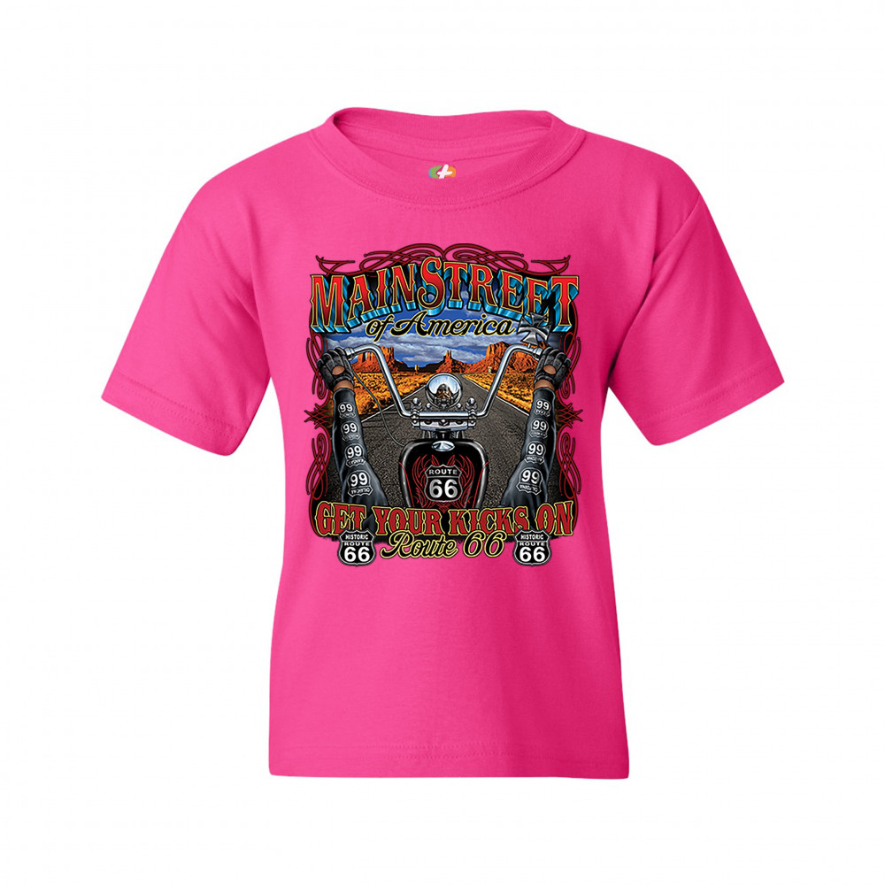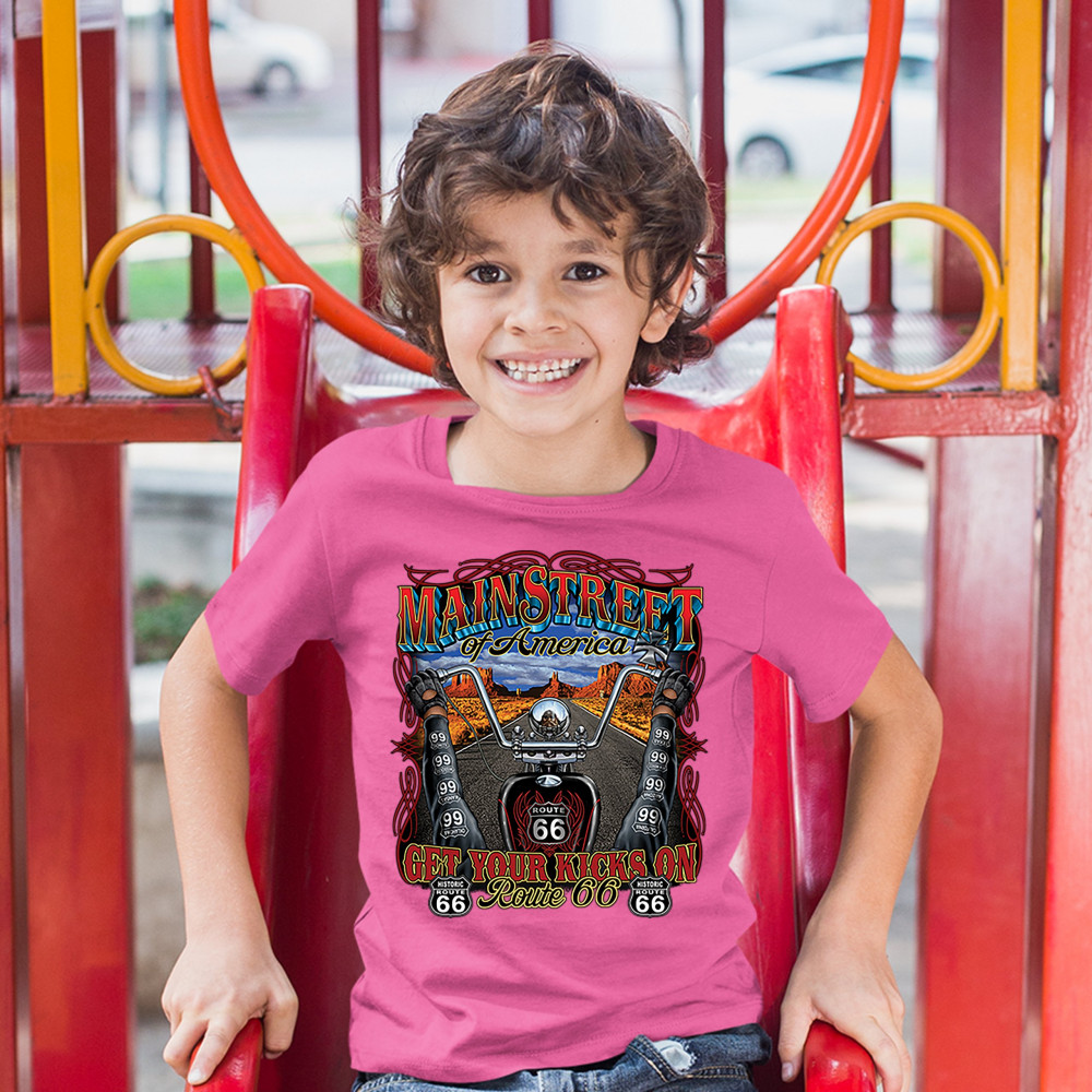 A print featuring a POV of a biker riding a chopper on a Route 66. There are are numerous "Route 66" and "Historic Route 66" signs all over the print and the print says: "Main street of America" and "Gwt your kicks on Route 66". A great choice for a motor