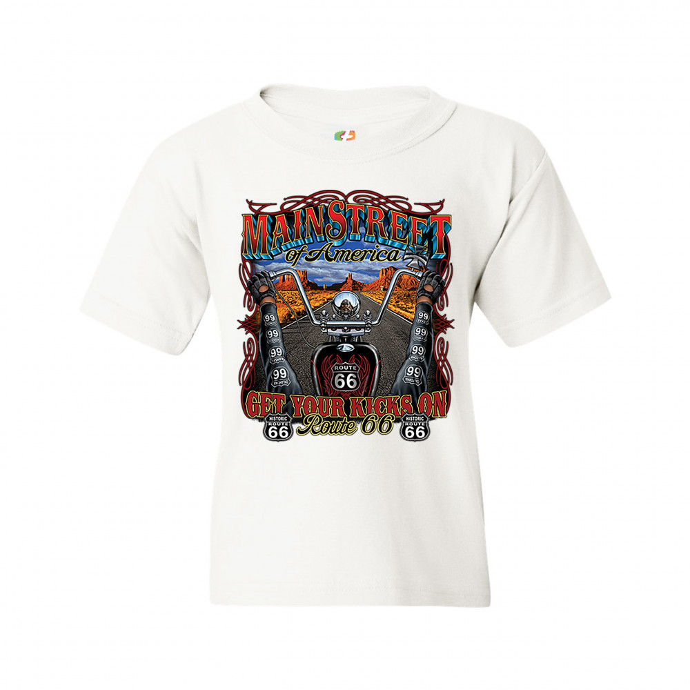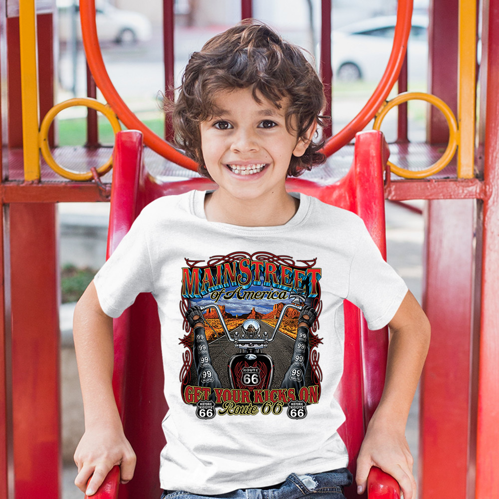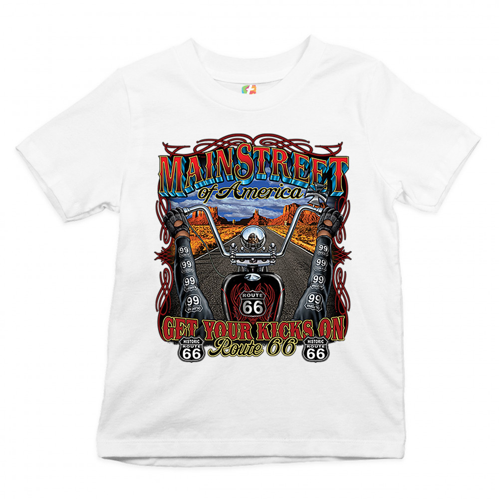 A print featuring a POV of a biker riding a chopper on a Route 66. There are are numerous "Route 66" and "Historic Route 66" signs all over the print and the print says: "Main street of America" and "Gwt your kicks on Route 66". A great choice for a motor