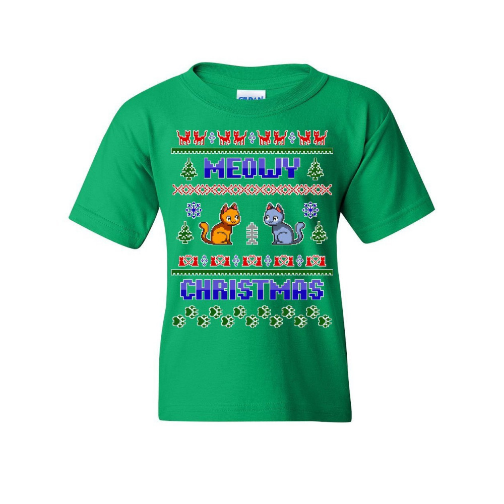 MEOWY CHRISTMAS UGLY SWEATER youth t-shirt cat kitten purr merry xmas kids tee green