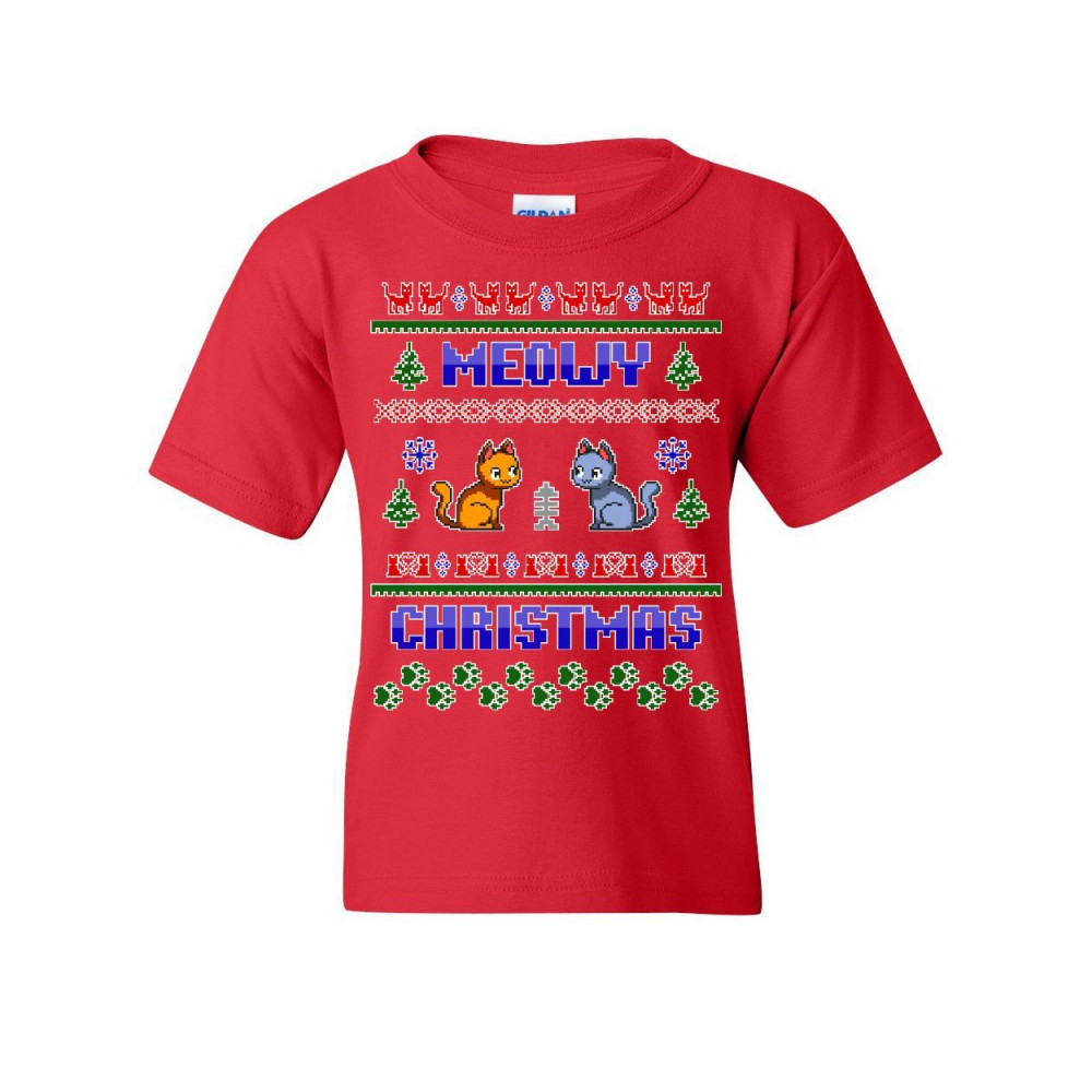MEOWY CHRISTMAS UGLY SWEATER youth t-shirt cat kitten purr merry xmas kids tee red