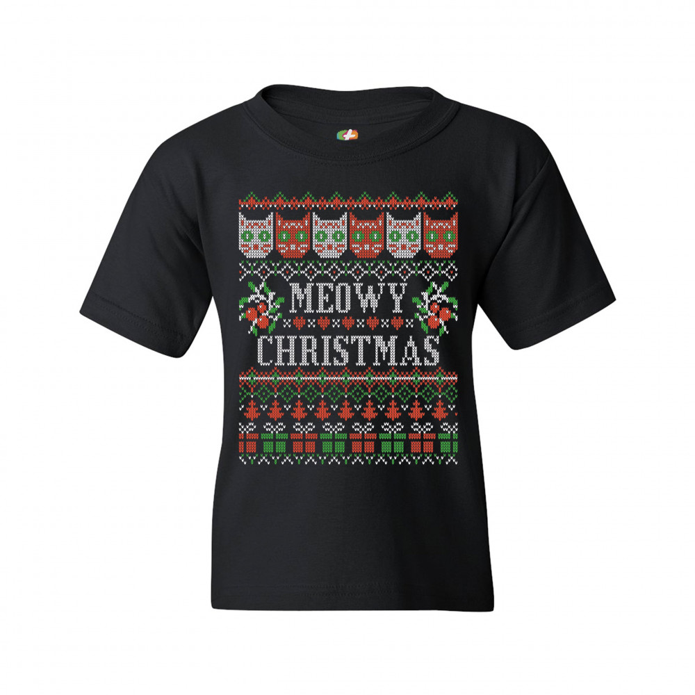 MEOWY CHRISTMAS youth t-shirt ugly sweater cat lover funny xmas kids black
