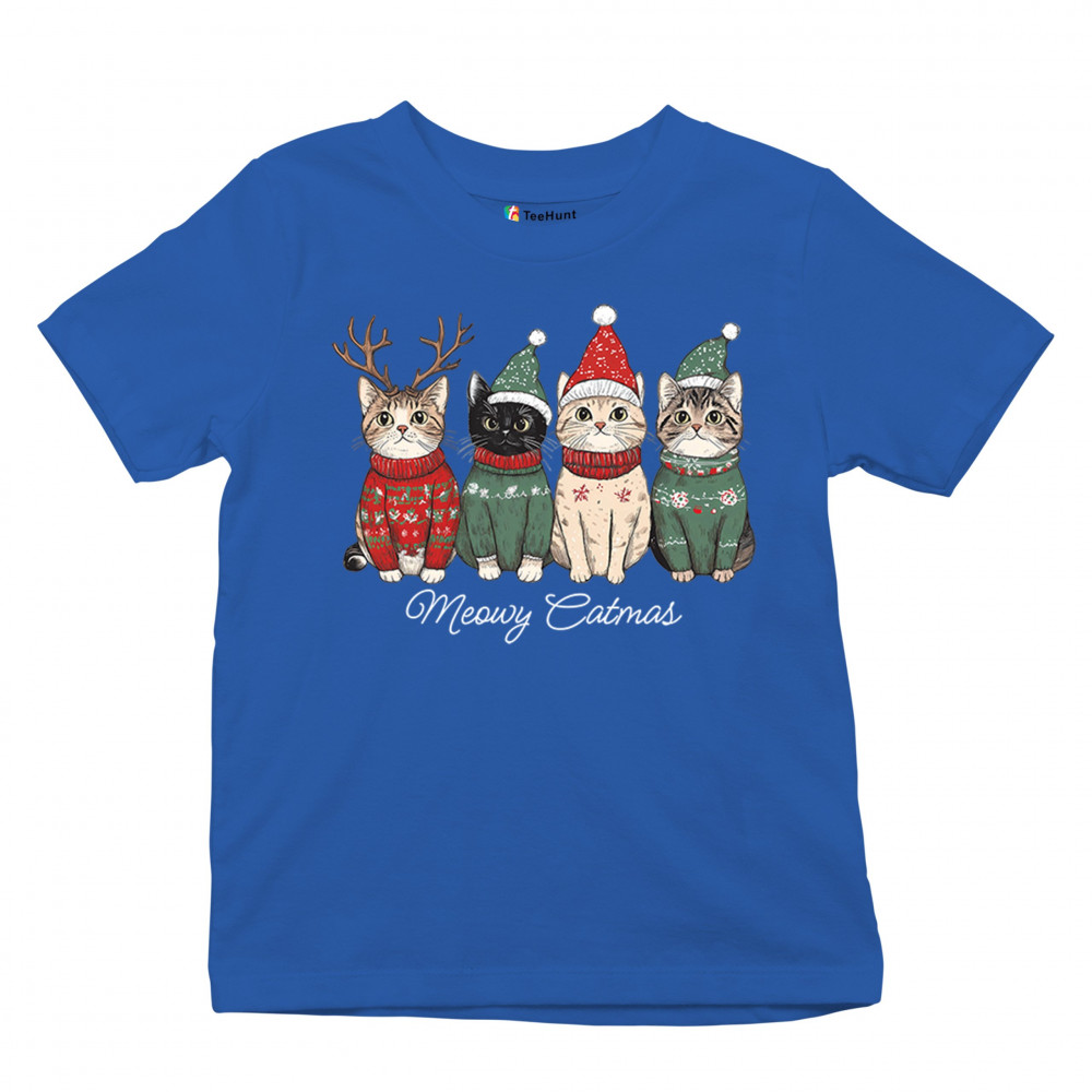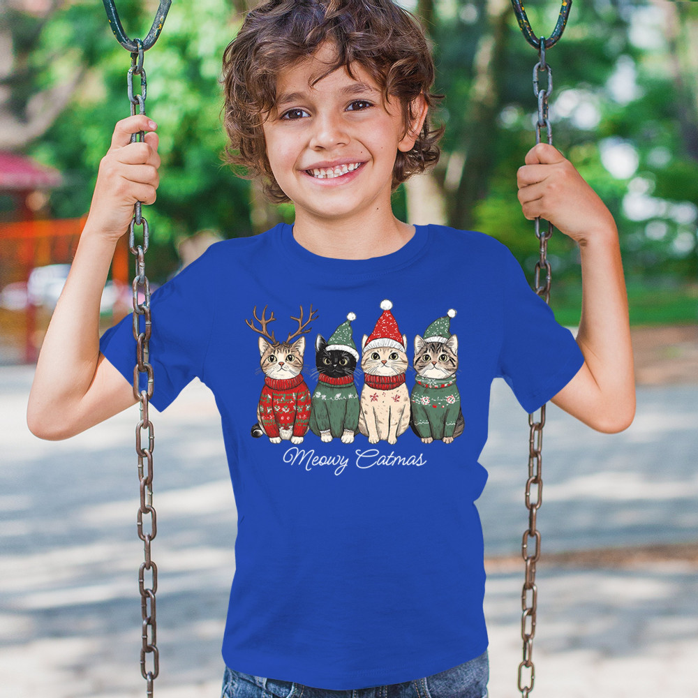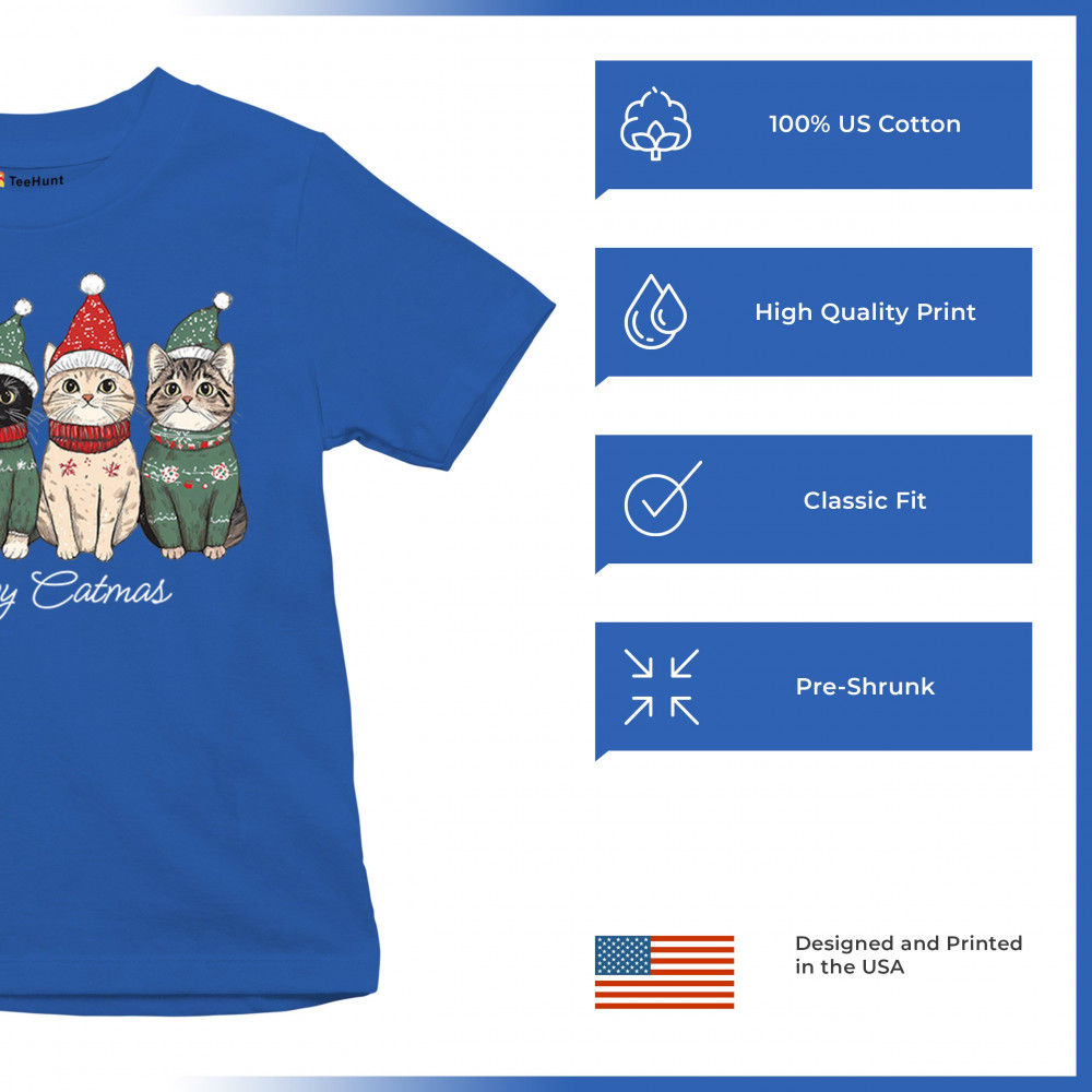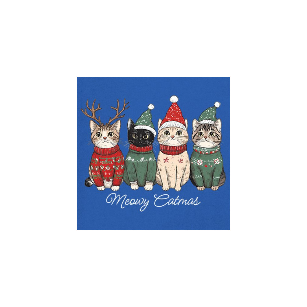 Cute Meowy Catmas design with festive kittens, perfect for cat lovers wanting a cozy holiday graphic and fun Christmas pet theme.