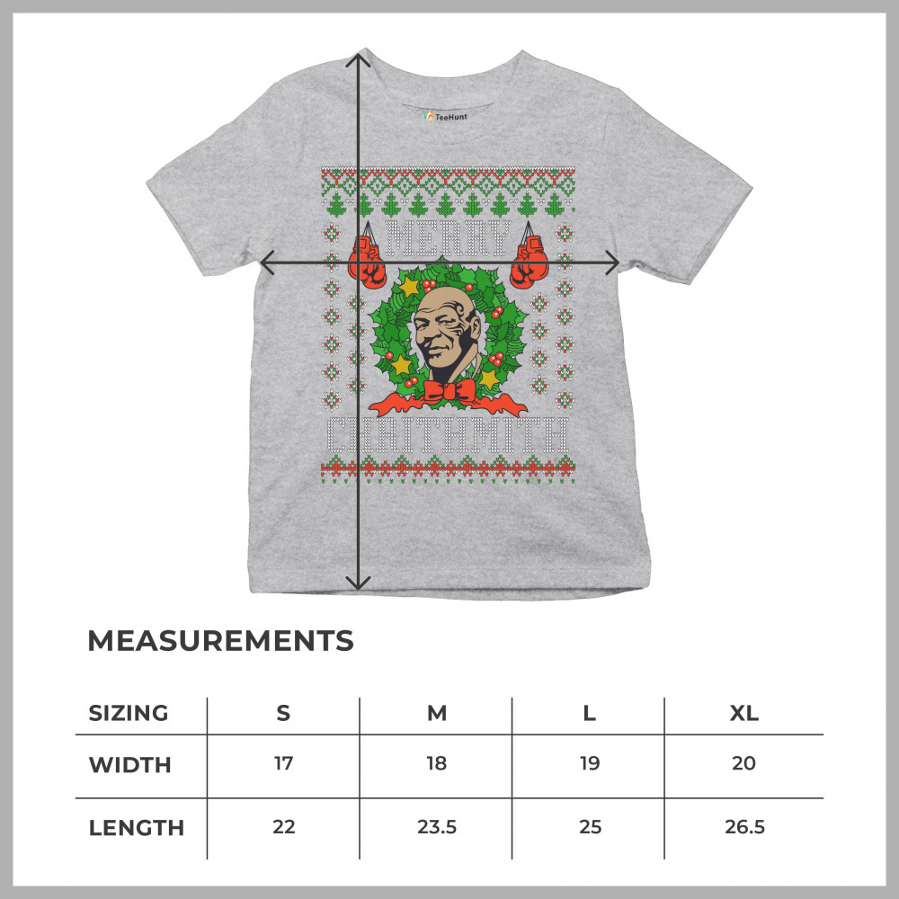 A print saying: "Merry Chrithmith" and featuring the face of Mike Tyson inside of a Christmas chaplet and two pairs of boxing gloves. The print is designed as an ugly sweater. Amazing choice to make people smile and spread positive vibes on Christmas Eve.