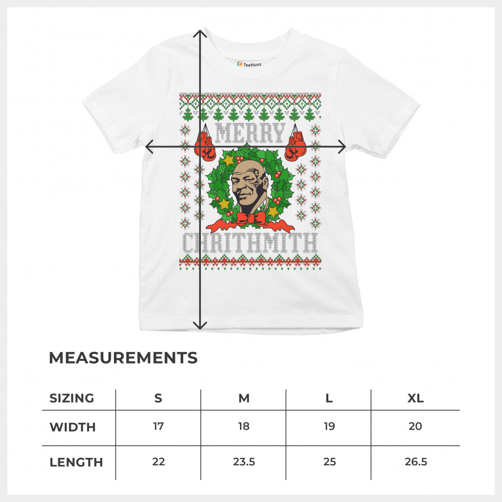 A print saying: "Merry Chrithmith" and featuring the face of Mike Tyson inside of a Christmas chaplet and two pairs of boxing gloves. The print is designed as an ugly sweater. Amazing choice to make people smile and spread positive vibes on Christmas Eve.
